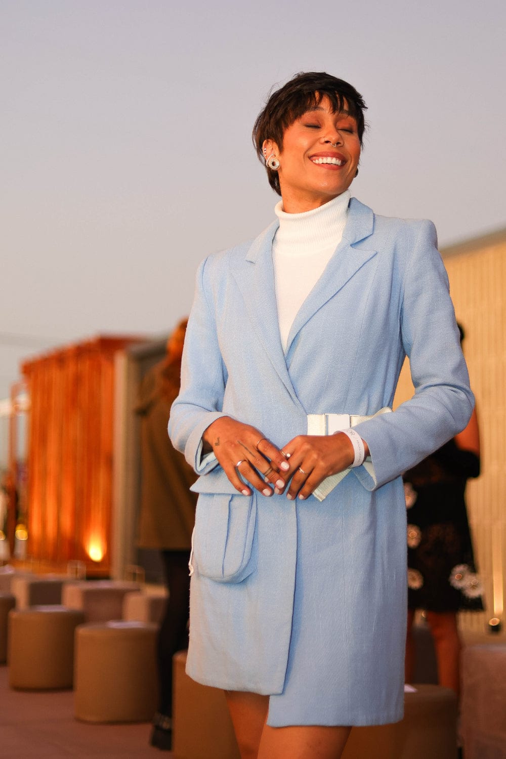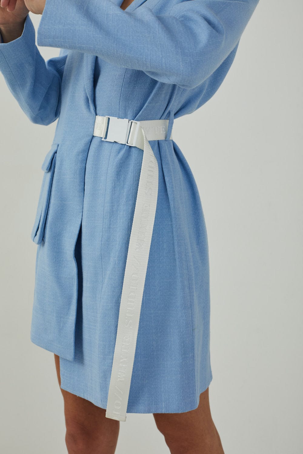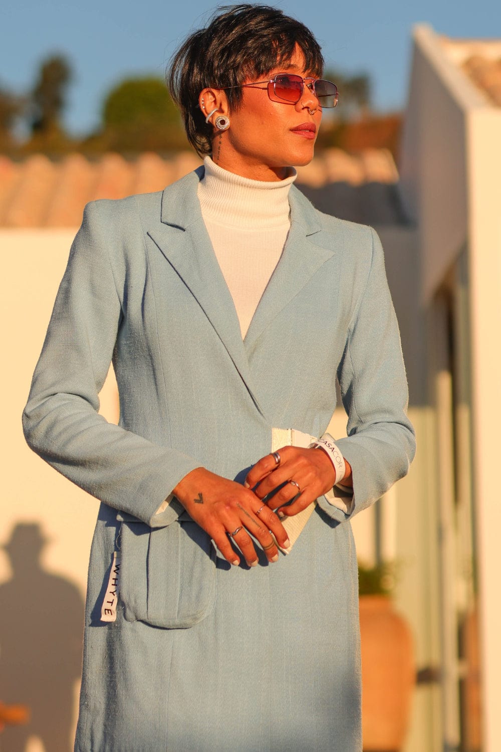 Com shape estruturado, fechamento cruzado assimétrico e cinto embutido, o vestido-blazer em tom azul claro traz sofisticação moderna com toque urbano.