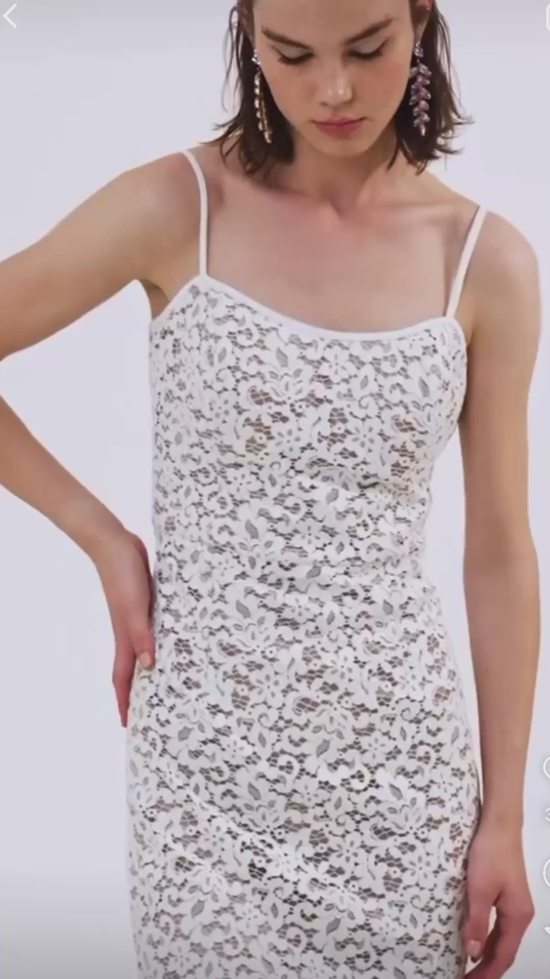 Vestido midi em renda com alças finas e silhueta ajustada.