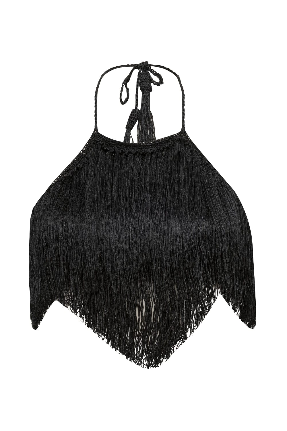 A trama de crochet tece a forma piramidal da peça , que é coberta por farta franja , em fios de seda, dando movimento e sutileza.