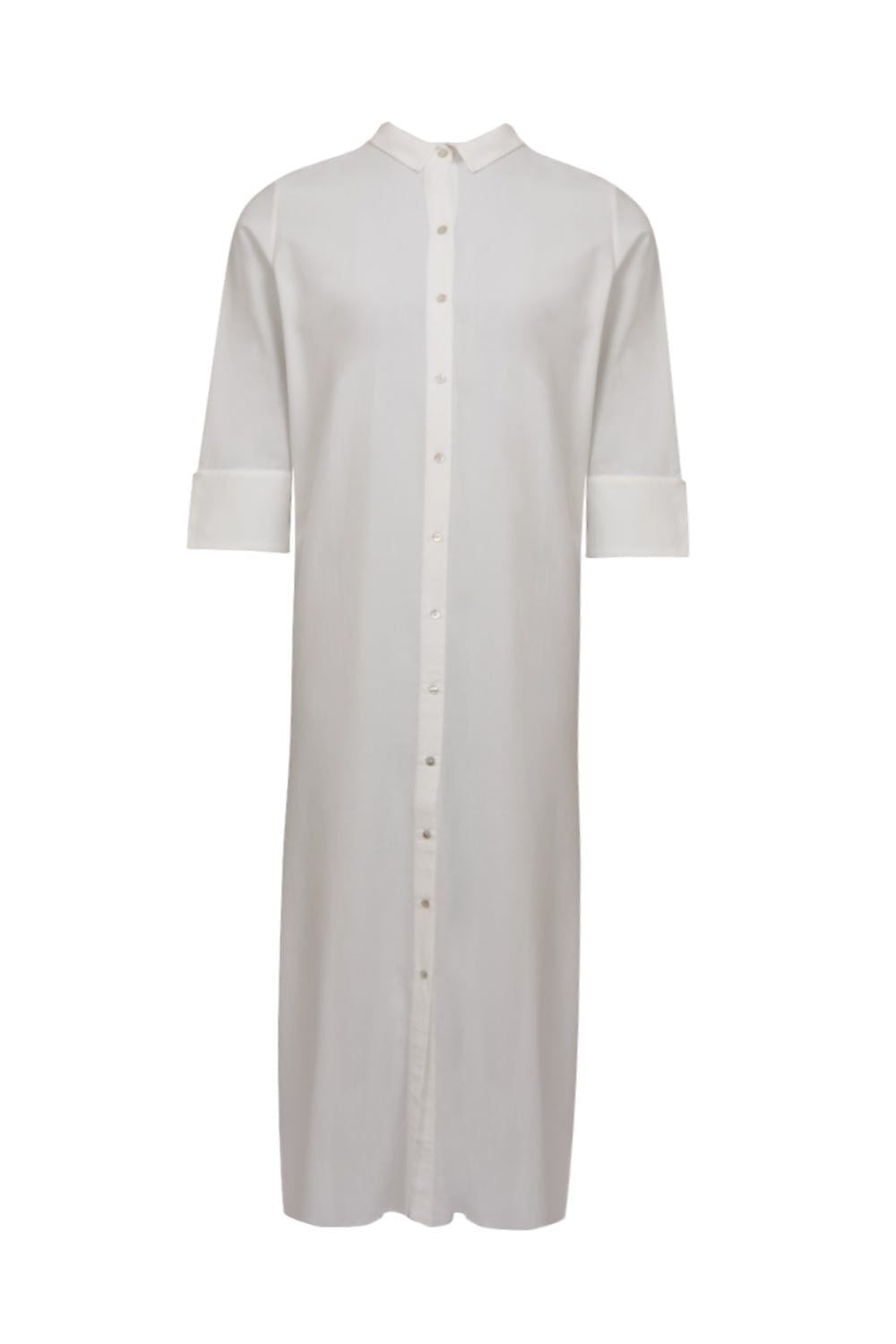 Vestido longo com mangas longas e abotoamento de camisaria, com pregas na frente.