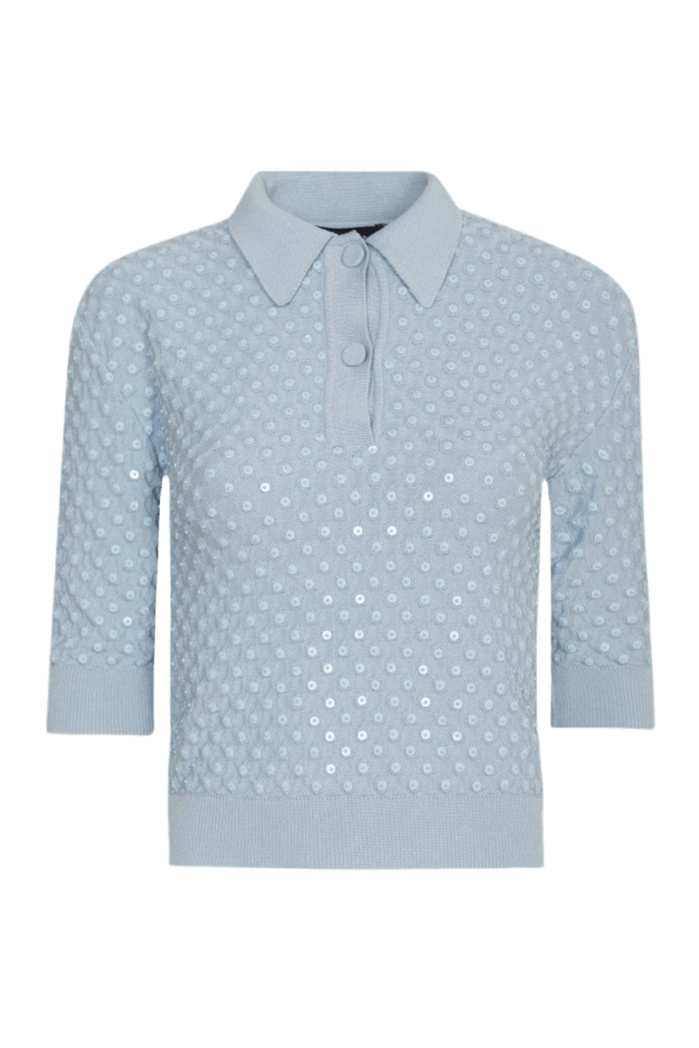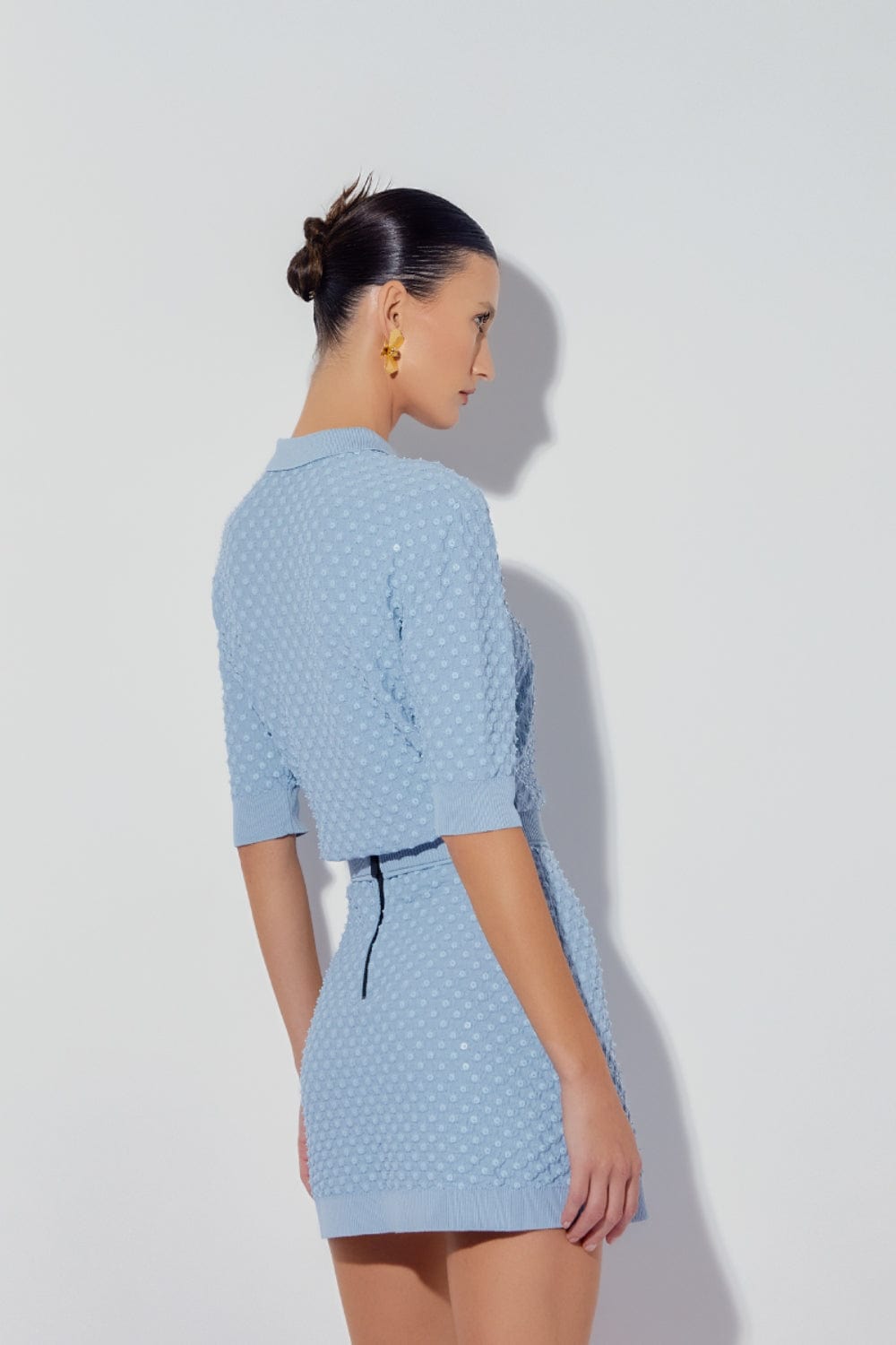 Possui manga curta, gola de tricô liso, barra de tricô canelado e patte até a altura dos seios com fechamento por botões encapados.