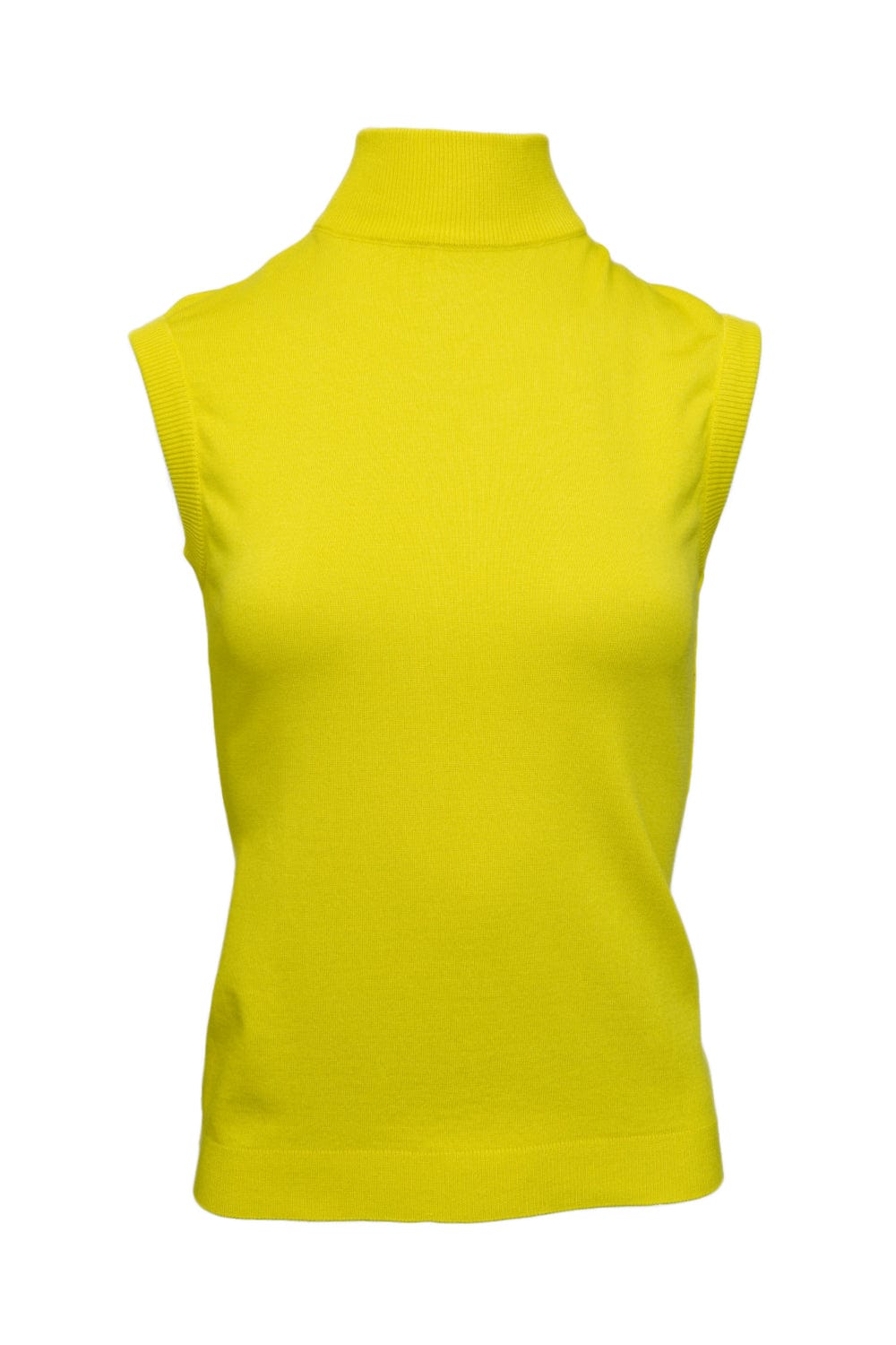 Regata com modelagem próxima ao corpo, comprimento regular, cava reta e gola alta. Conta com barra, cava e gola feitos em tricô canelado.