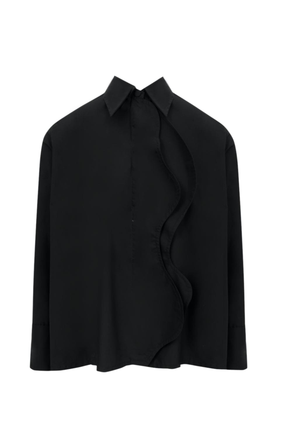 Camisa confeccionada em tricoline de algodão com ondulações sobrepostas à parte frontal, que carrega caminhos inspirados nas mãos de Paulo Werneck