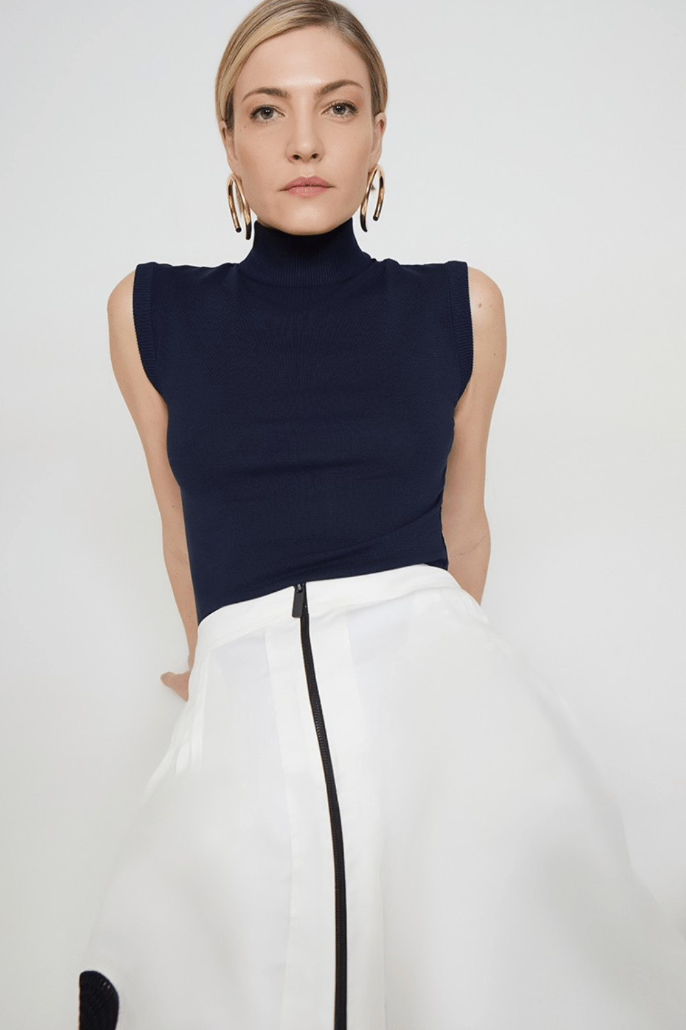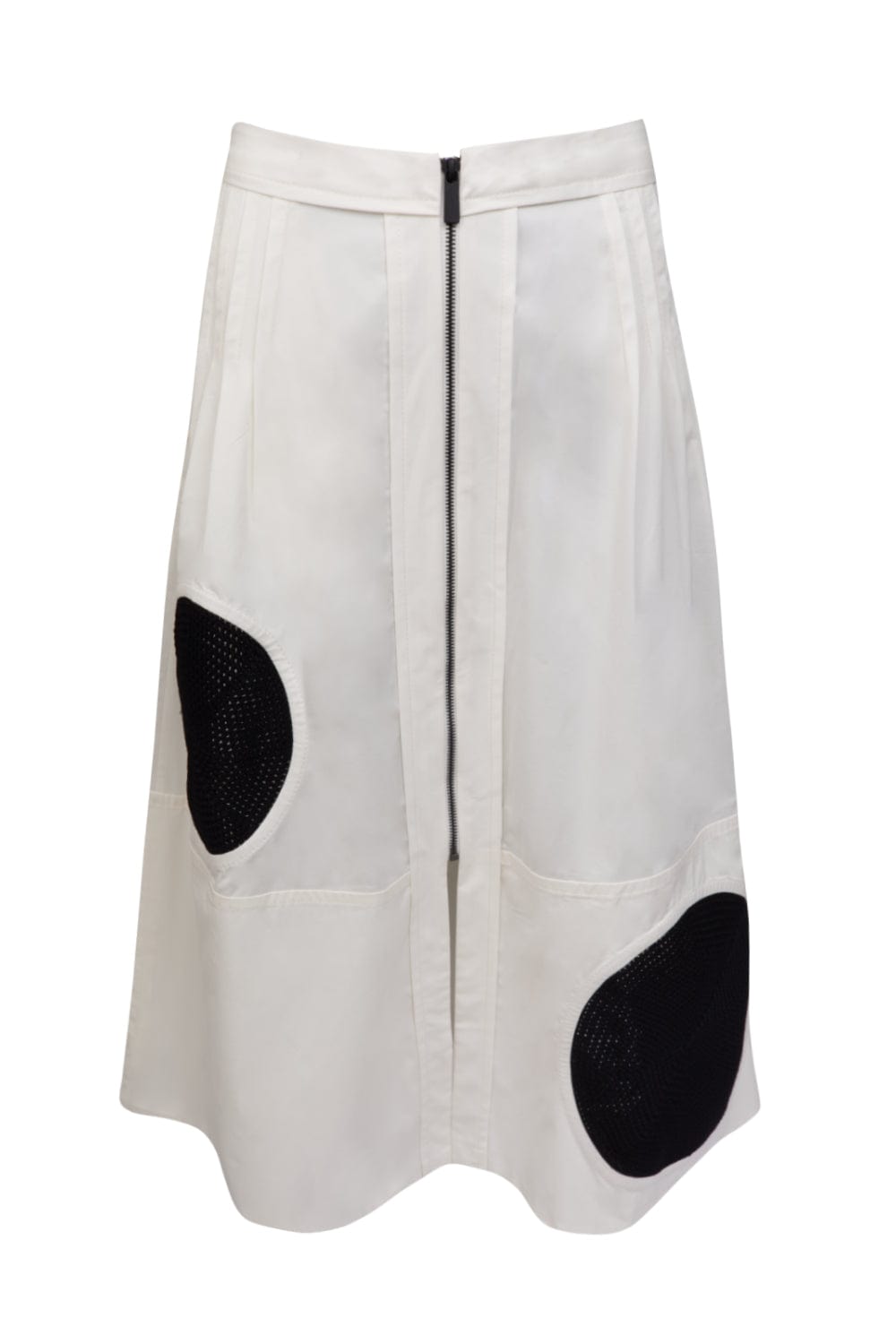A saia é confeccionada em tecido de algodão com pregas rebatidas no quadril.