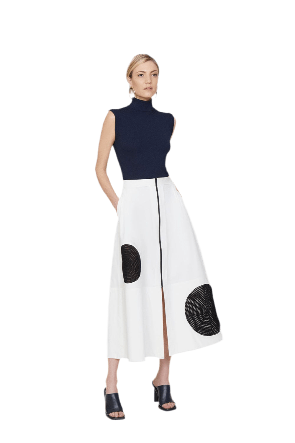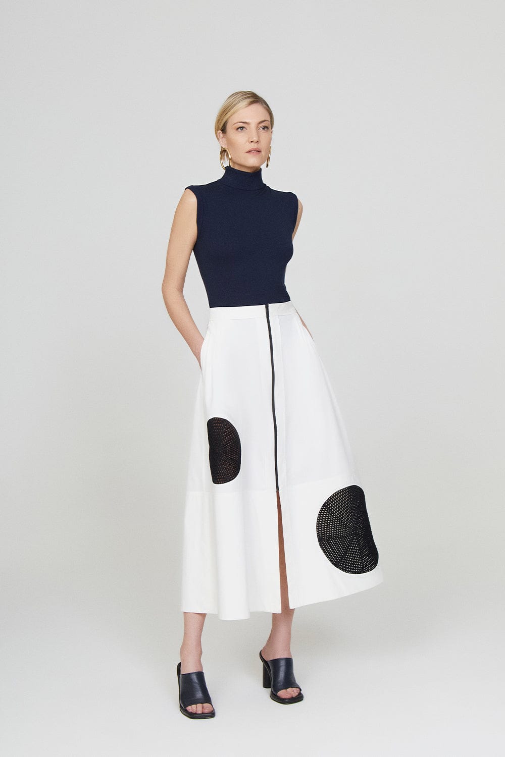 A peça de modelagem evasê, cintura alta, possui bolsos embutidos nas laterais, fechamento frontal por zíper de metal com fenda, pespontos na mesma cor do tecido, comprimento midi e barra larga.