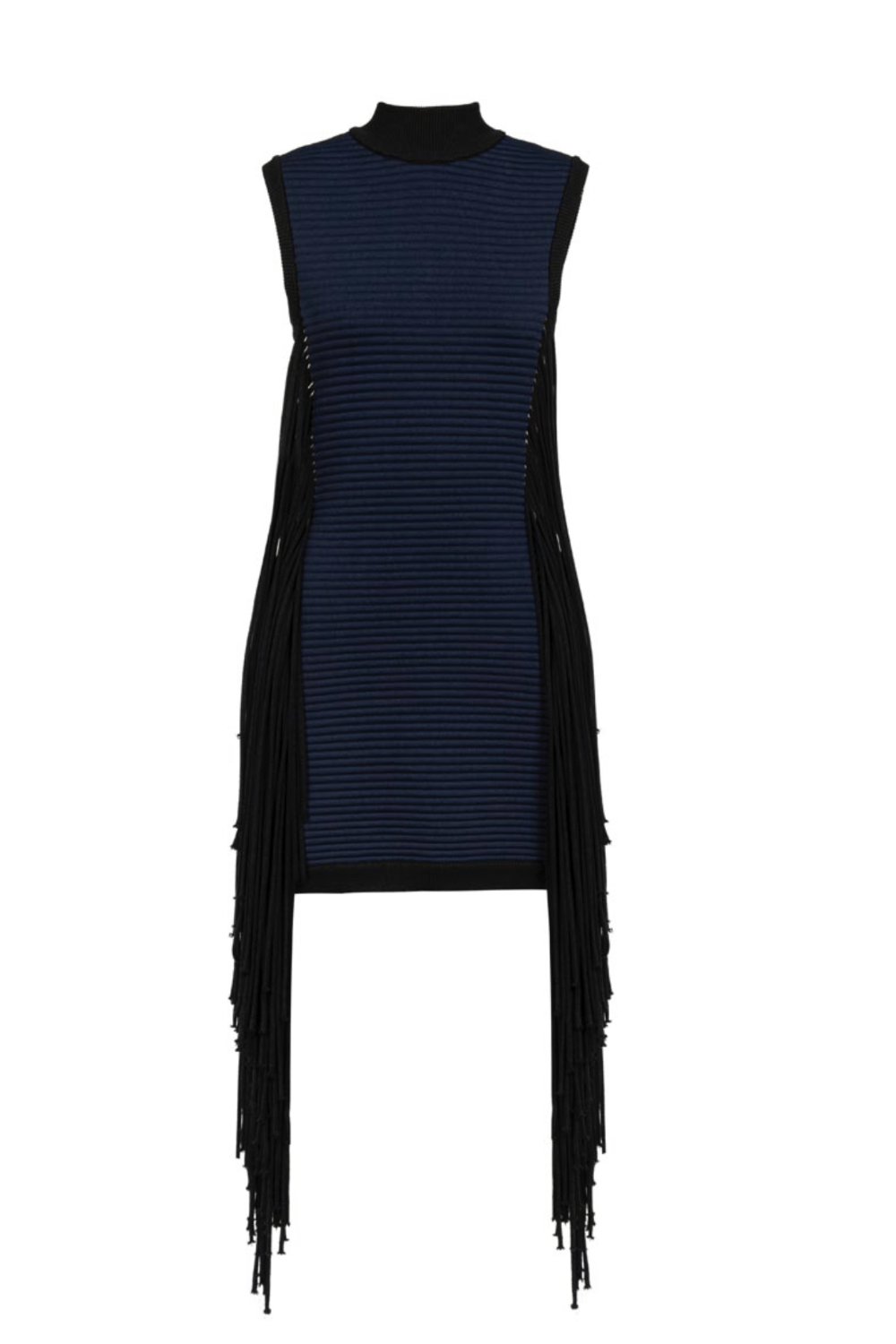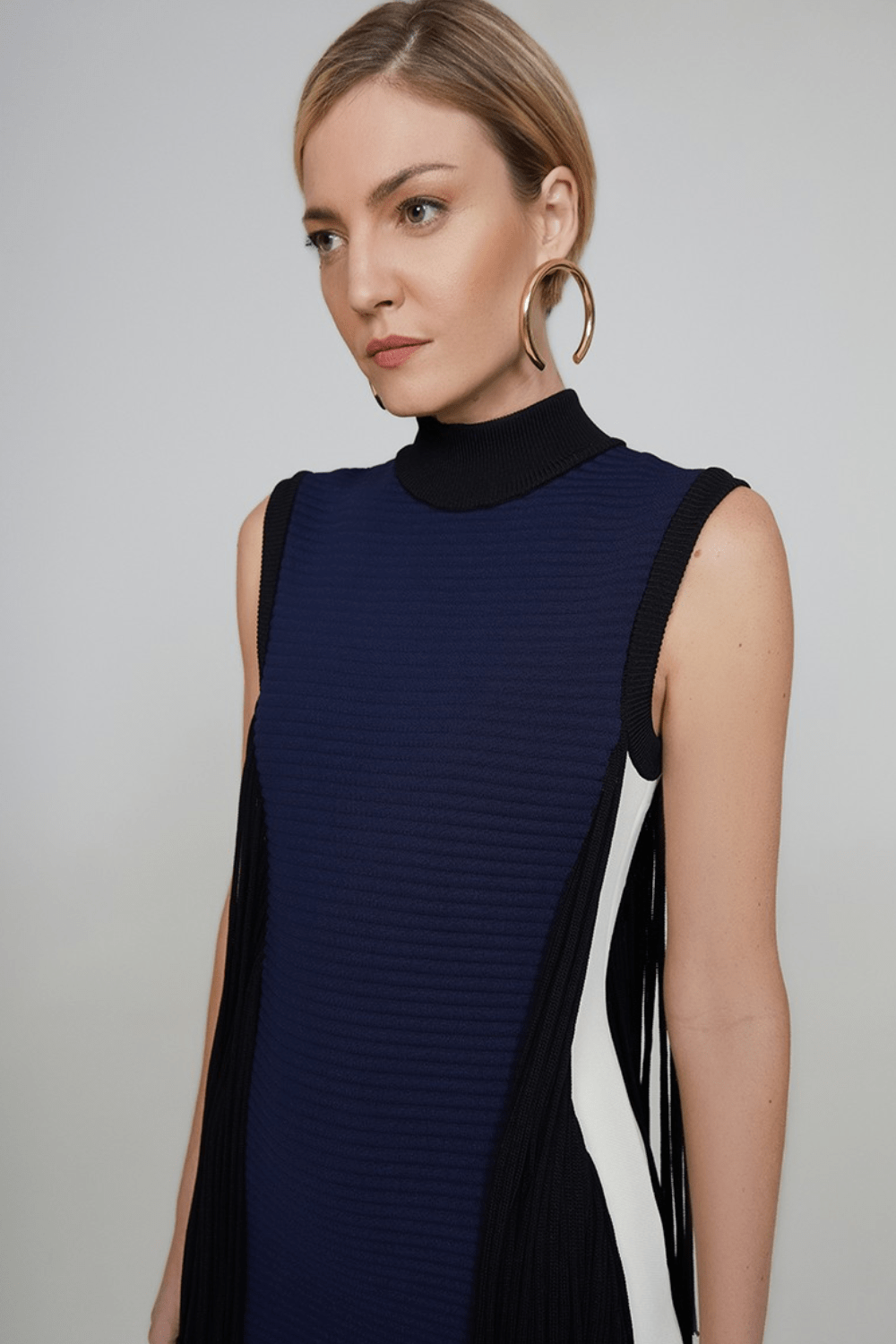 Conta com acabamento de tricô canelado na gola, na cava e na barra, fechamento traseiro por zíper de metal.