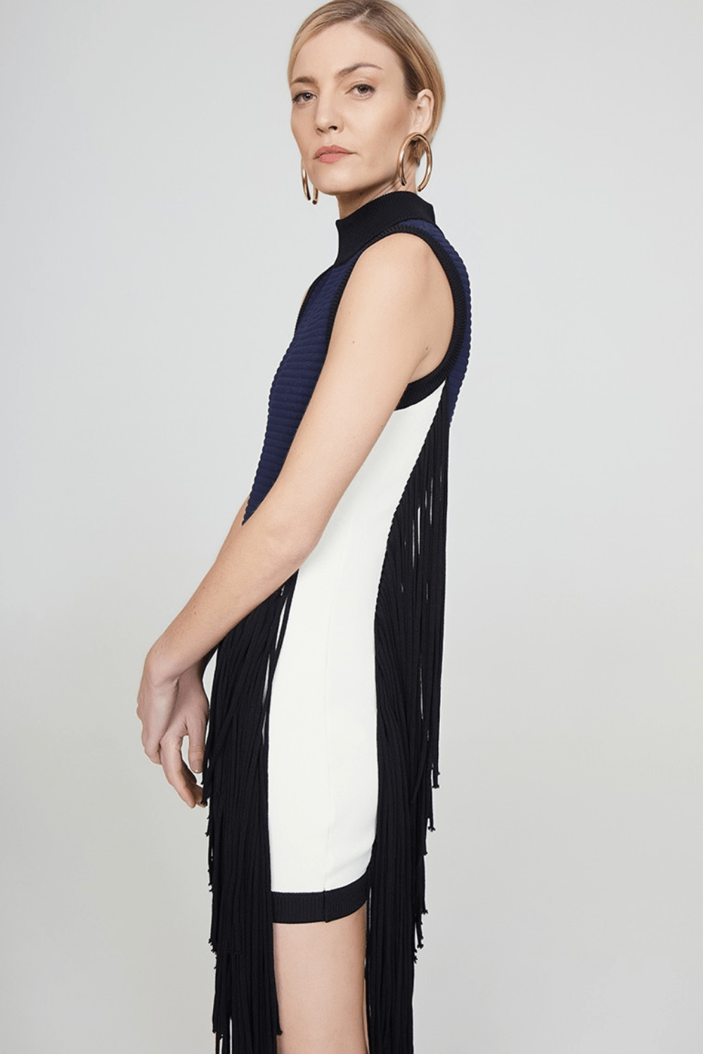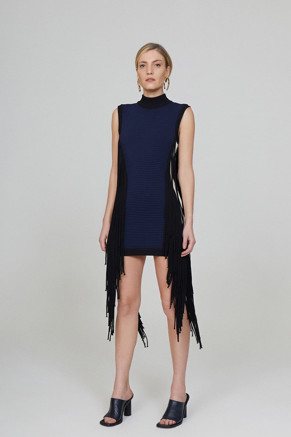 Vestido de modelagem próxima ao corpo, comprimento mini, gola alta e cava reta.