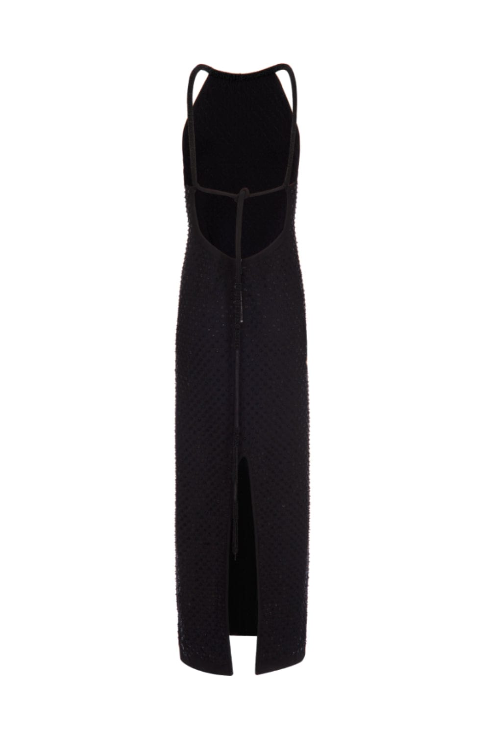 Conta com tubular e cordão encapado bordados por miçangas na cor do tricô, que percorre o decote e alças finalizando nas costas formando uma amarração.