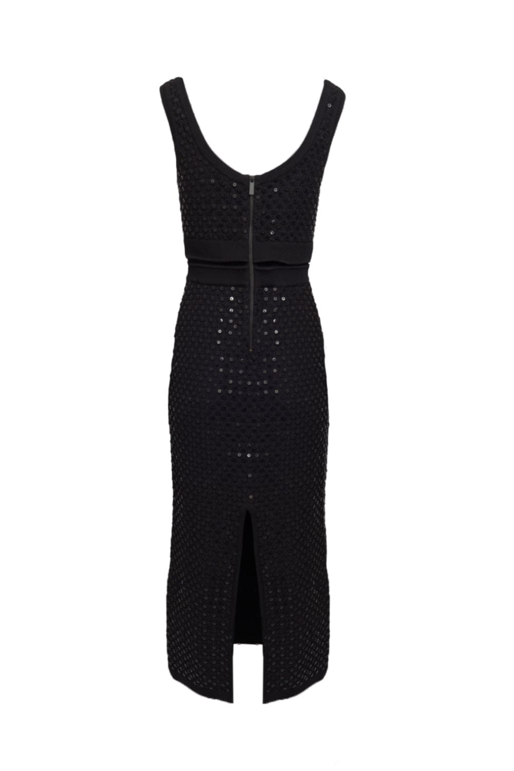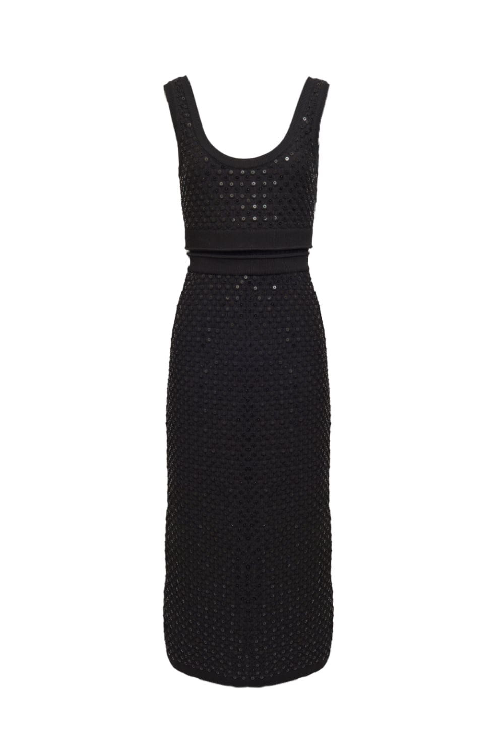 Vestido regata de comprimento midi, decote arredondado, modelagem próxima ao corpo, saia reta, feito em tricô texturizado.