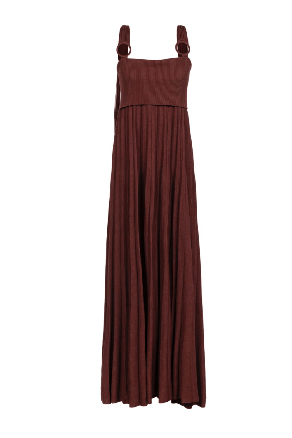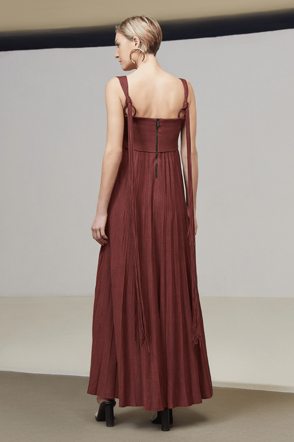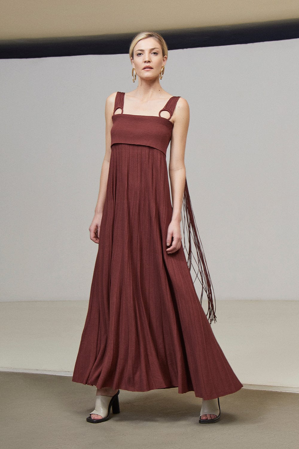 Coven - Vestido Longo Tricot Plissado Alças Franjas Marrom