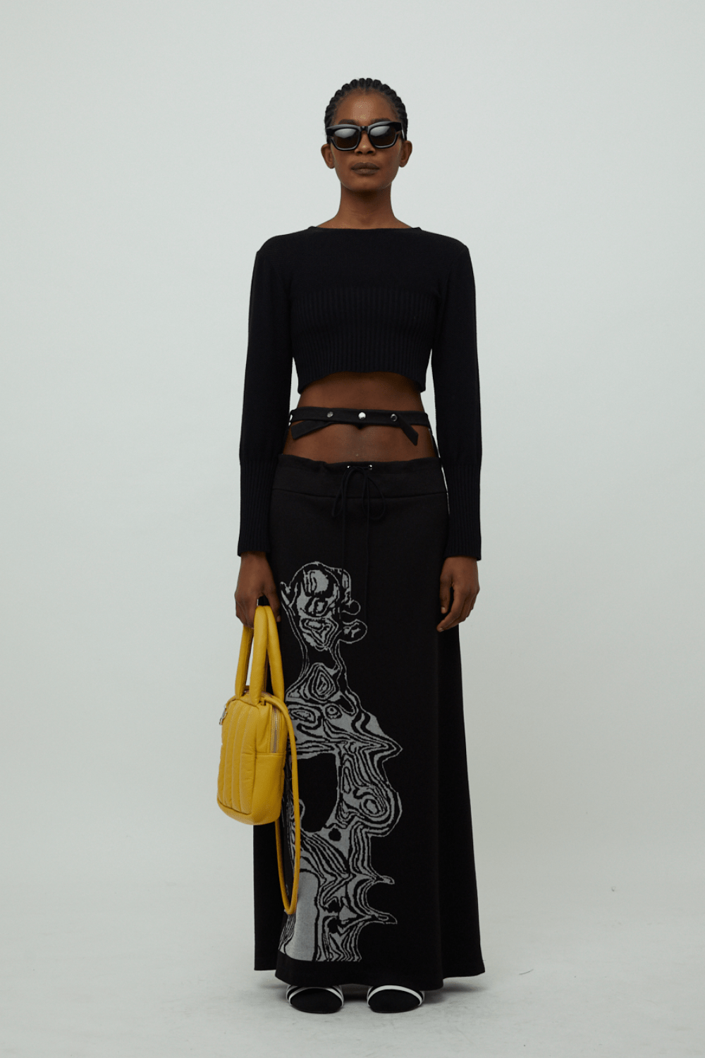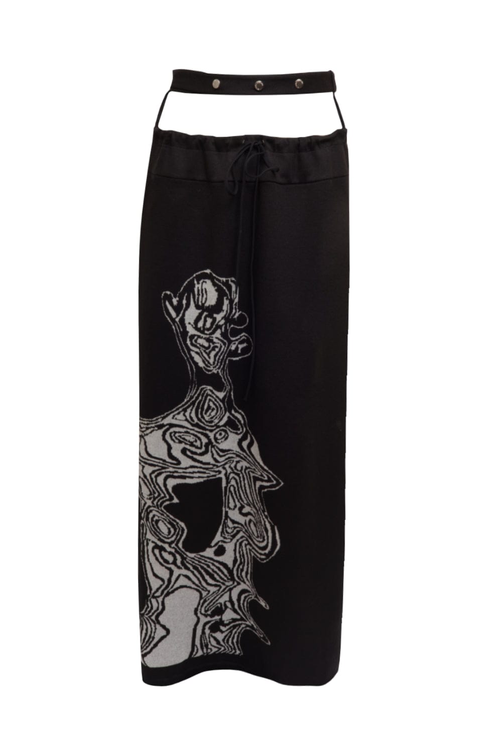 Saia longa em modelagem evasê com estampa Corpo Virtual.
