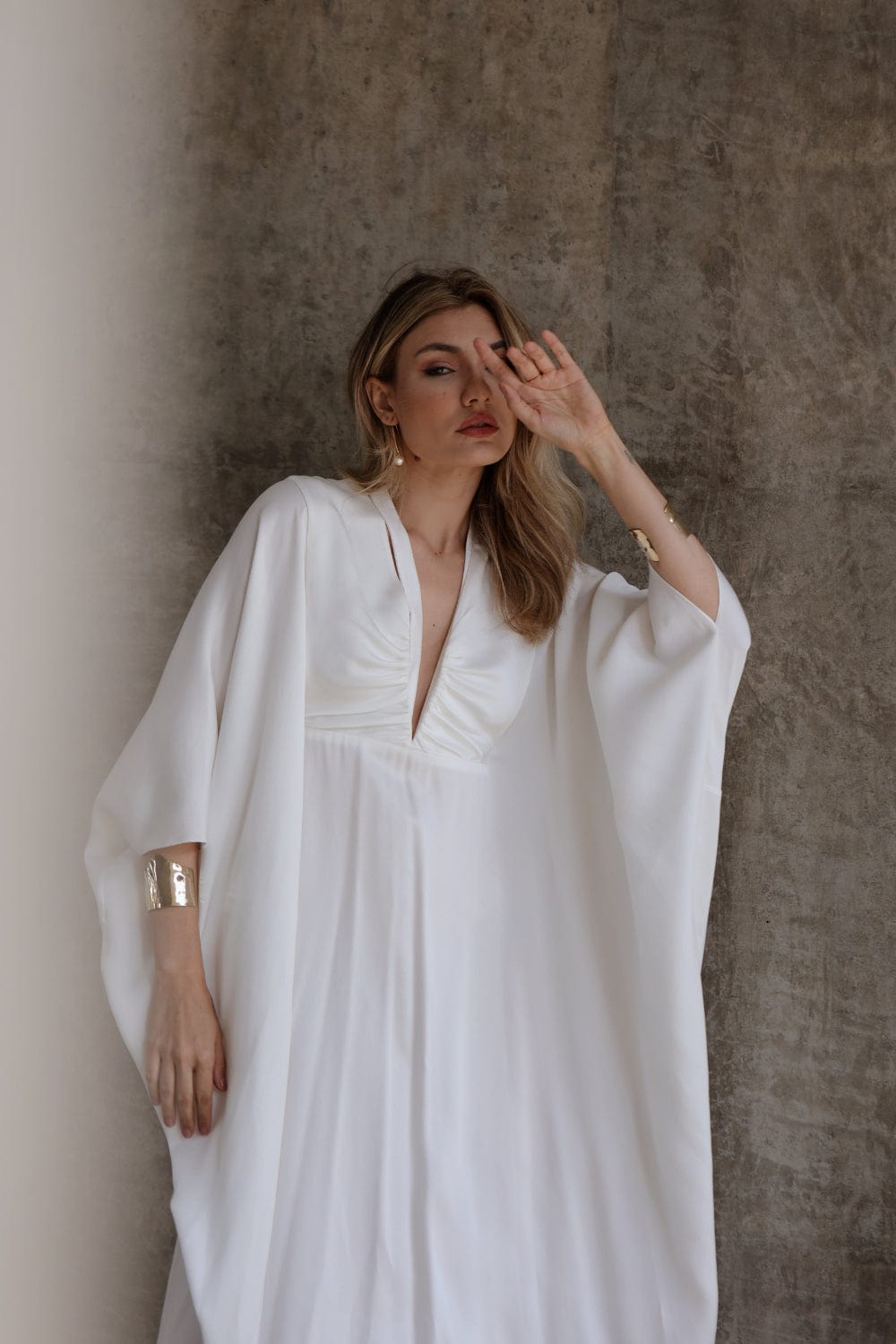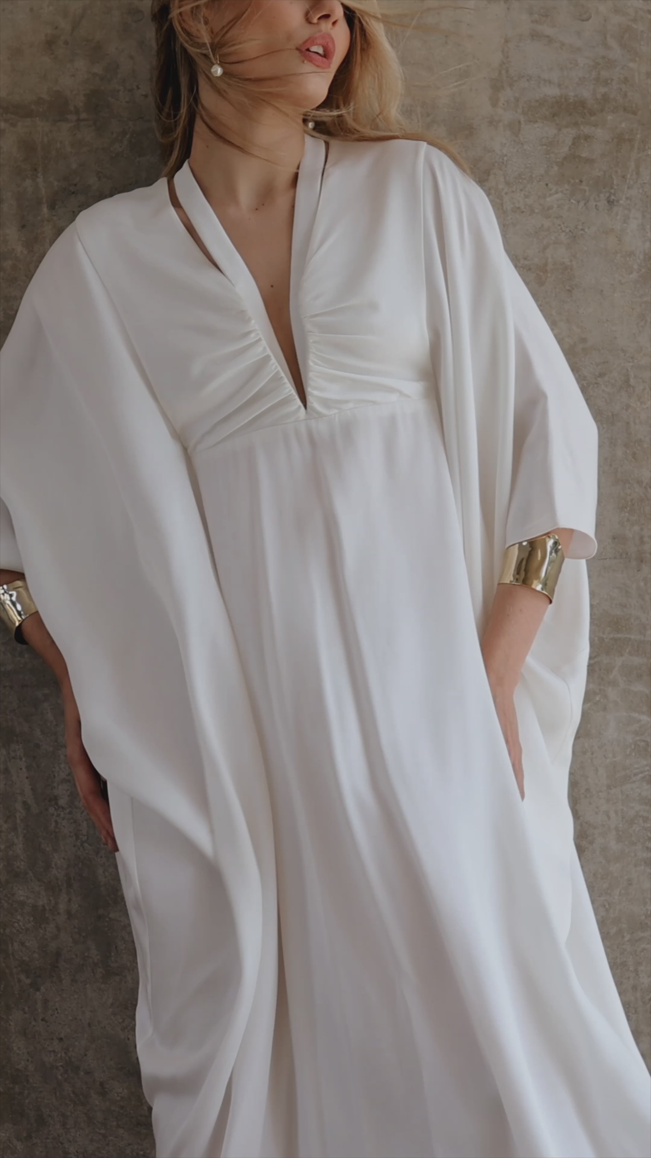 Em crepe patou, o caimento flui com leveza, enquanto as mangas amplas e o decote preciso revelam a essência da alfaiataria contemporânea brasileira.