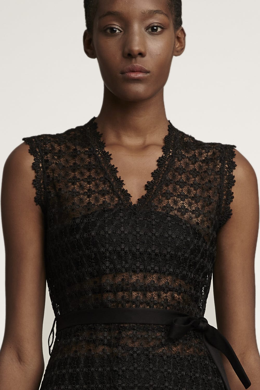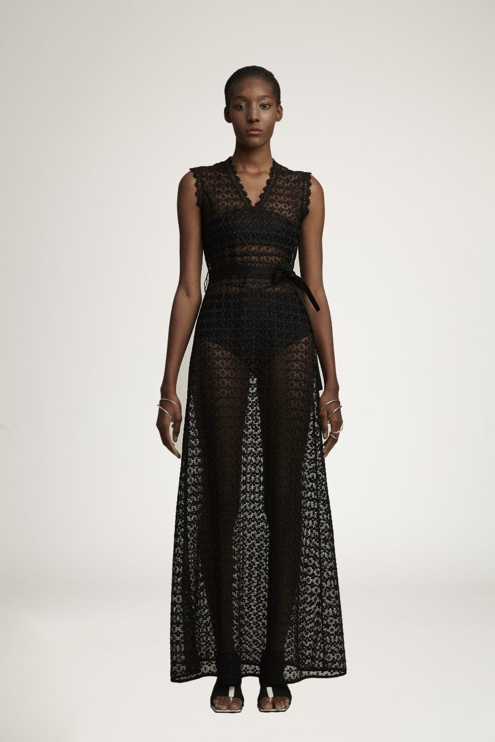 A cintura marcada e o caimento alongado criam uma silhueta refinada, onde a transparência sutil da renda encontra a sobriedade elegante do tecido interno.