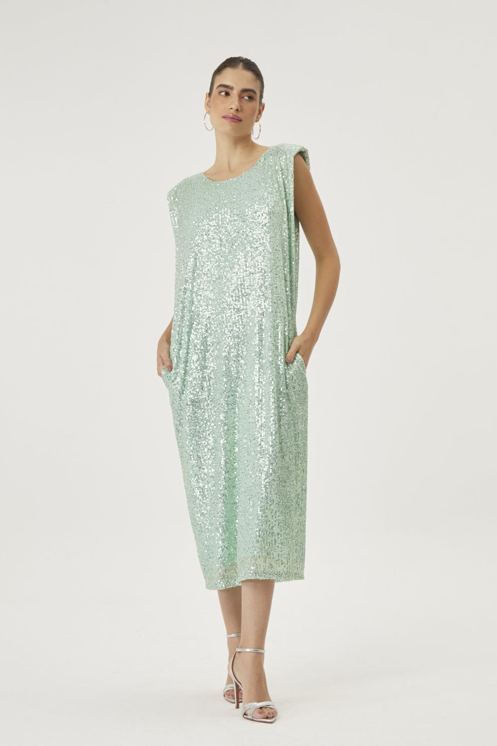 Glória Coelho - Vestido Midi com Ombreira Paetês Verde Aqua