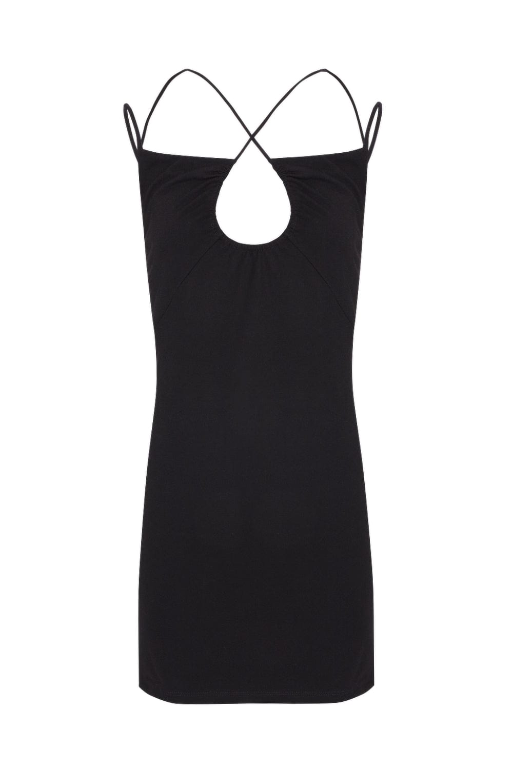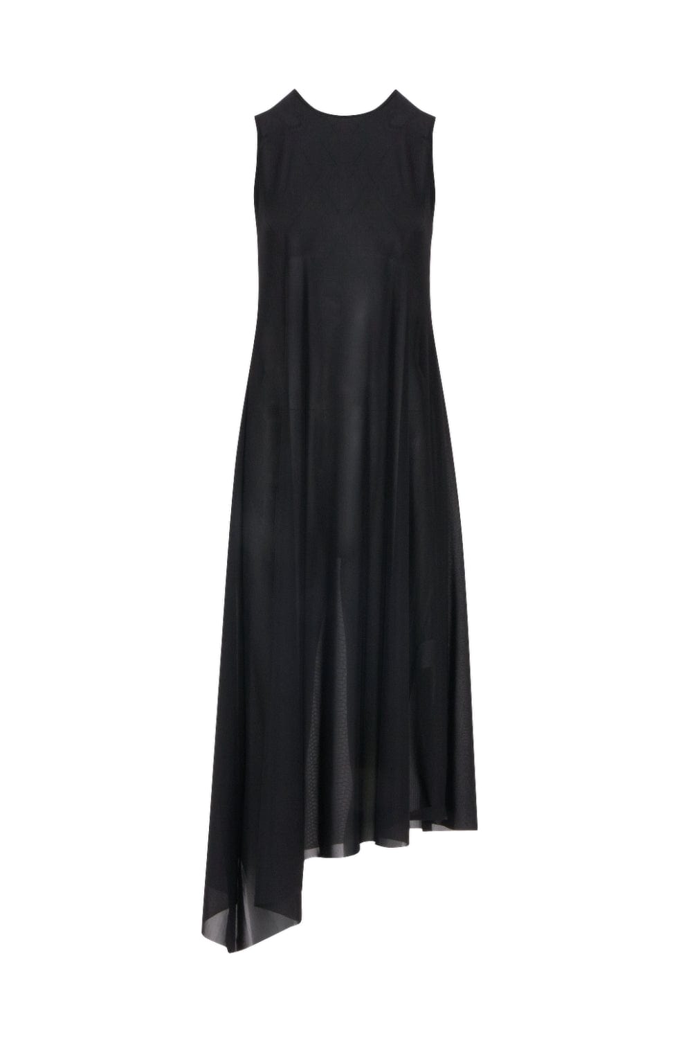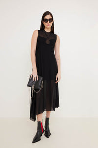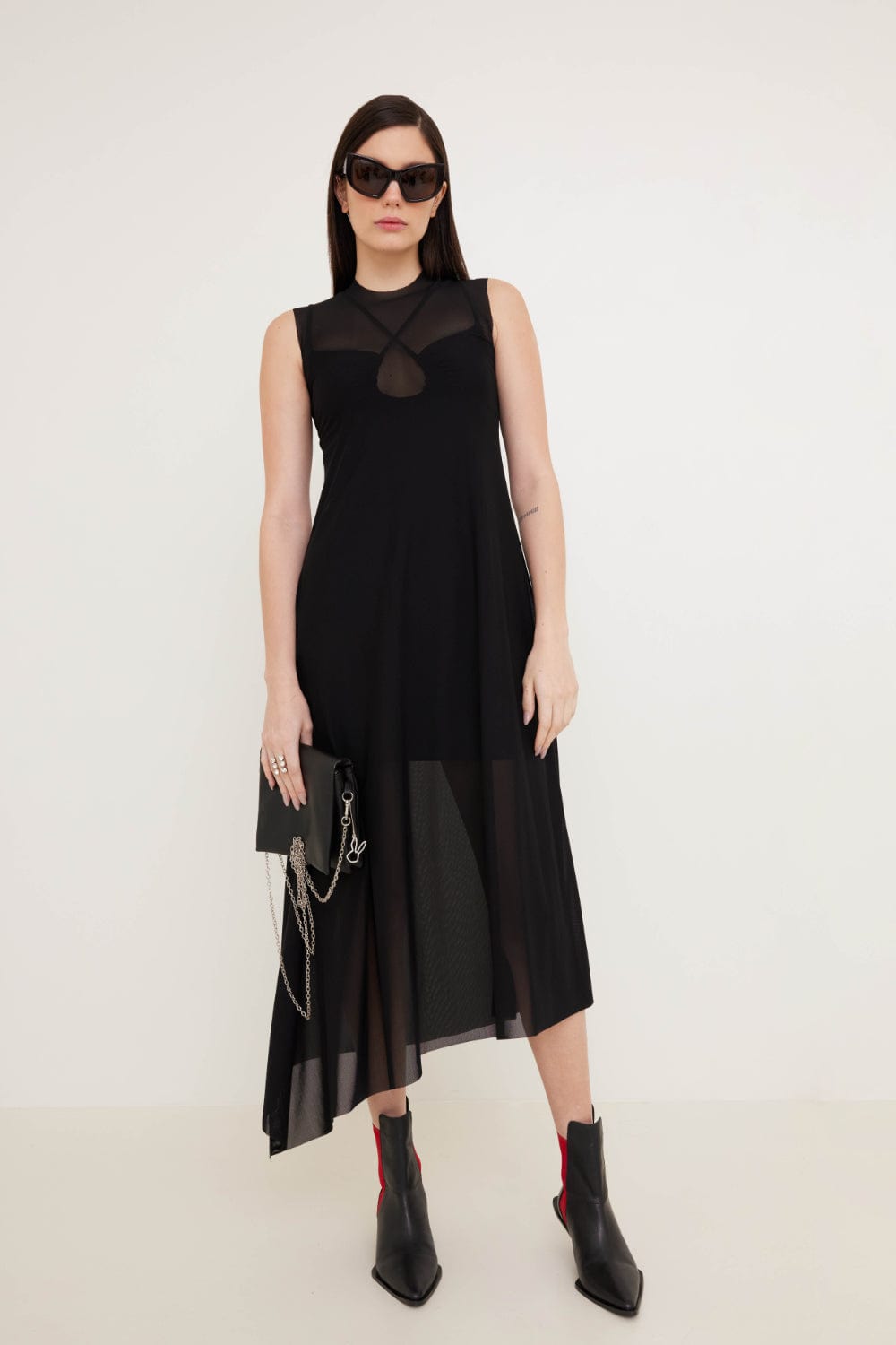 Vestido de comprimento midi com barra assimétrica, pregas no comprimento e transparência no busto e na saia.