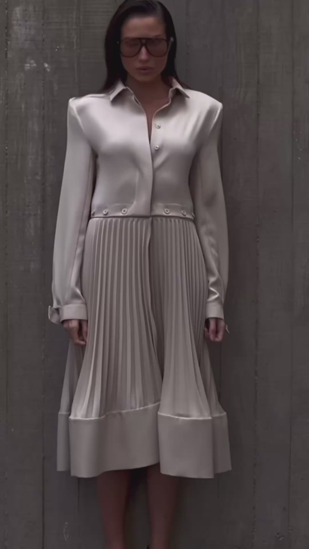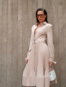 Glória Coelho - Vestido Midi Plissado Manga Longa Areia