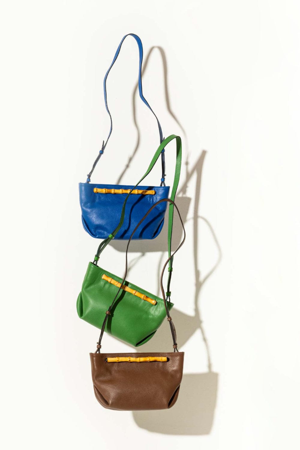 A peça possui formato retangular, compartimento interno com forro de tecido, detalhe de aplicação frontal e posterior em bambu, alça longa ajustável, acabamento pespontado e fechamento interno por botões magnéticos.