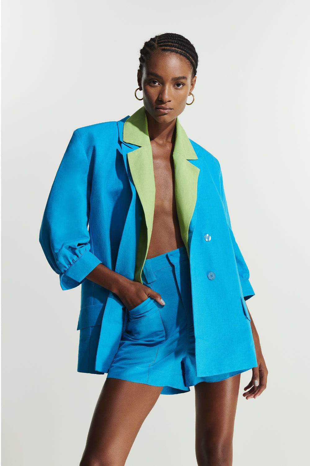 A peça possui lapela chanfrada, mangas 3/4 amplas com barra dupla, bolsos lateiras com lapelas, fecho frontal por meio de botões, modelagem ampla, comprimento alongado, caimento reto, shape solto e moderno.