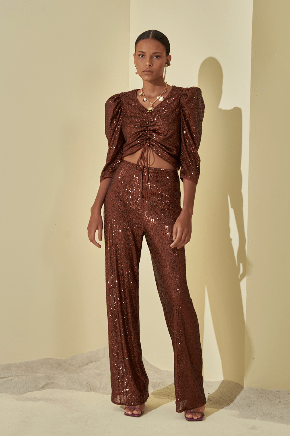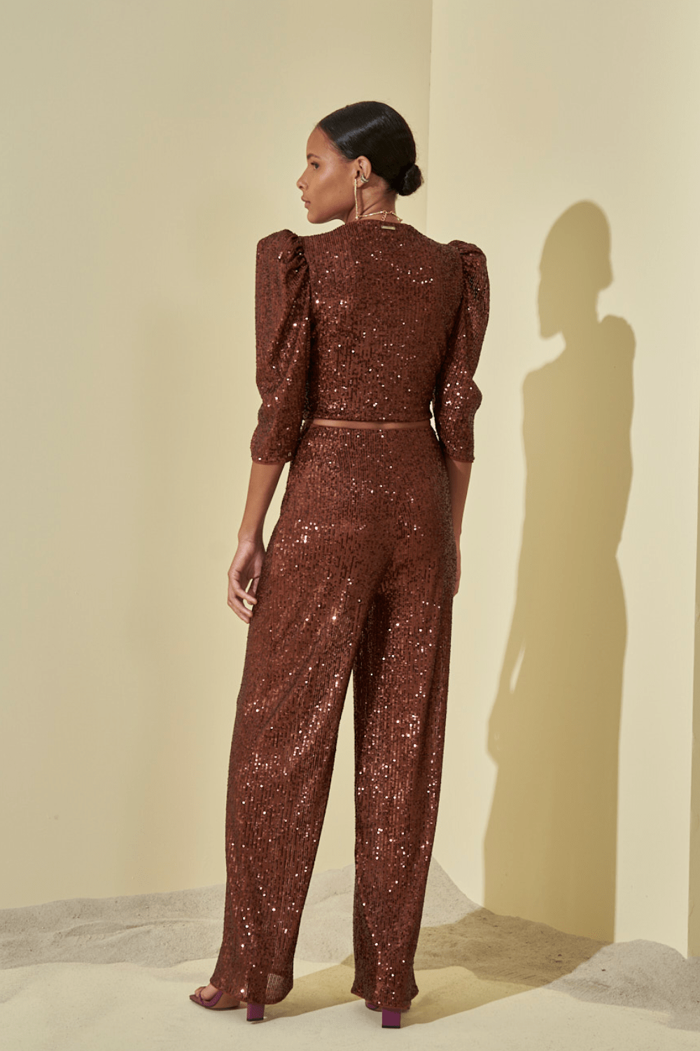 A peça possui cintura alta, fecho por meio de zíper semi-invisível na lateral esquerda, modelagem reta e shape slim.