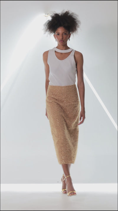 Saia possui cintura alta, cós duplo com abertura nas costas em zíper semi invisível embutido, forro interno e fenda lateral até a barra.