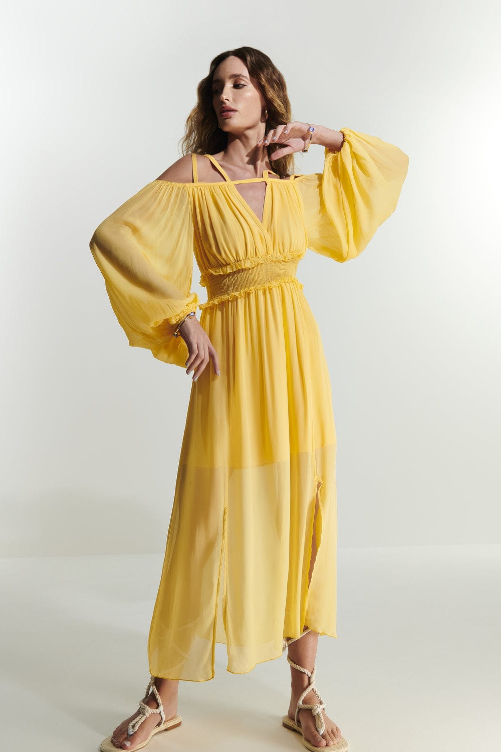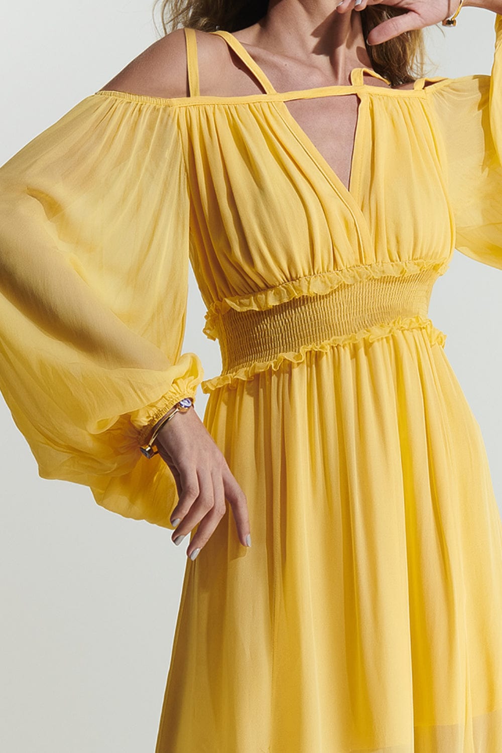 L'Cecci - Vestido Midi Fluido Recortes Simétricos Amarelo