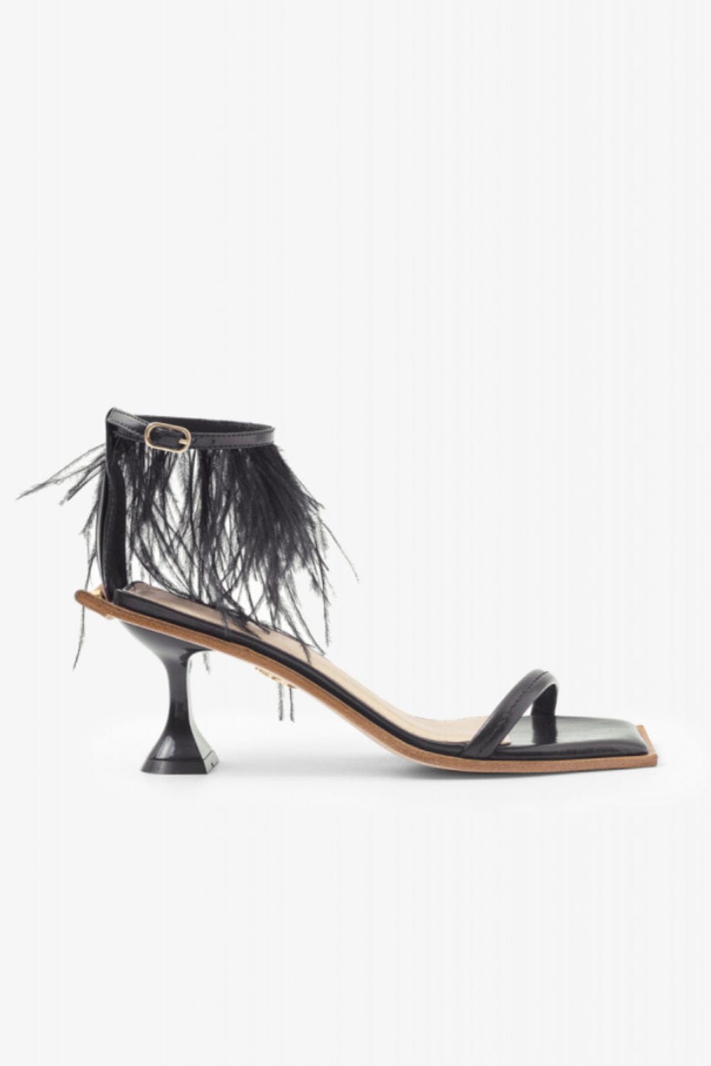 Contraforte drapeado, vira externa de couro, sola de couro e salto taça 7 cm.