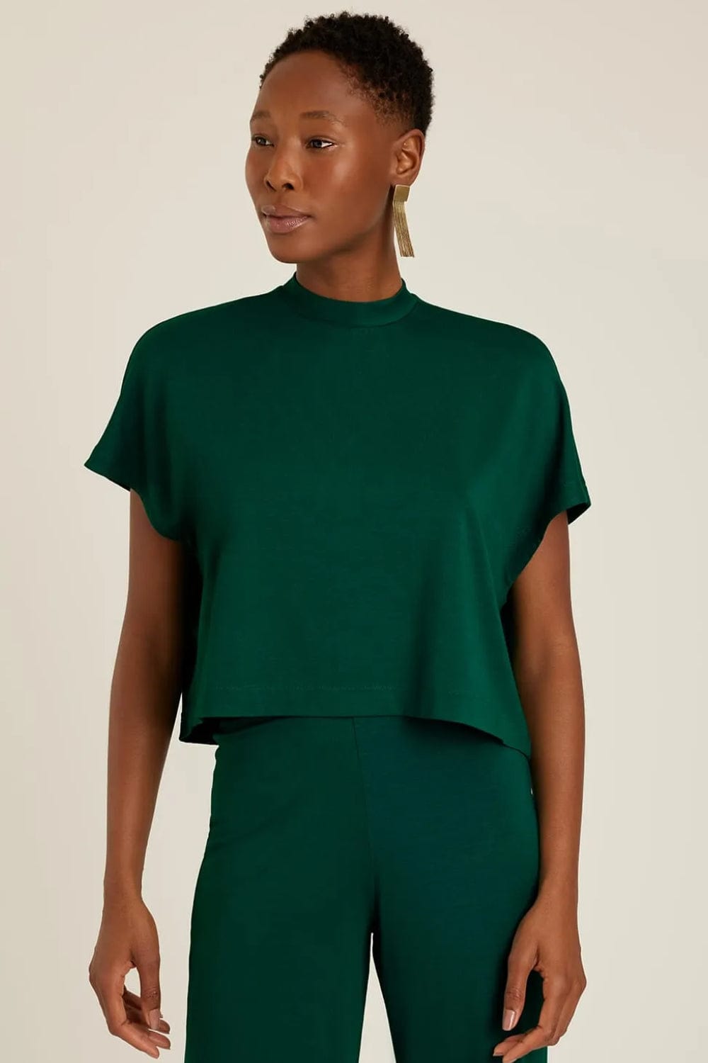 A blusa de malha possui gola alta e compõe um conjunto casual com a calça de malha moletinho no clássico verde-floresta.