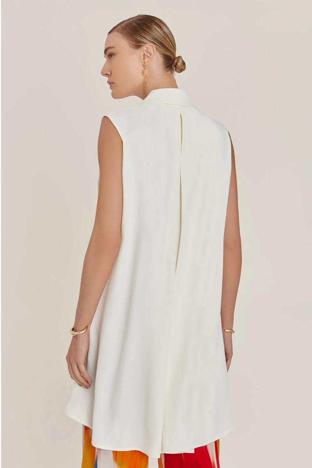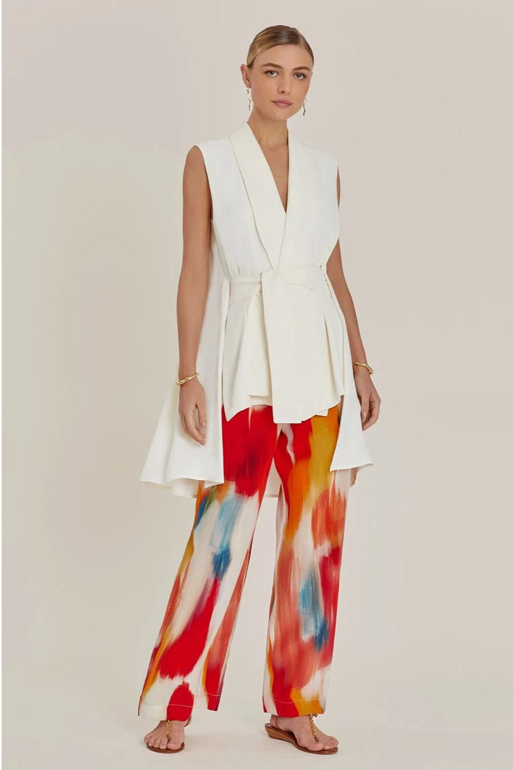 Blusa feminina off white com modelagem de colete, acompanha faixa avulsa para amarração na cintura.