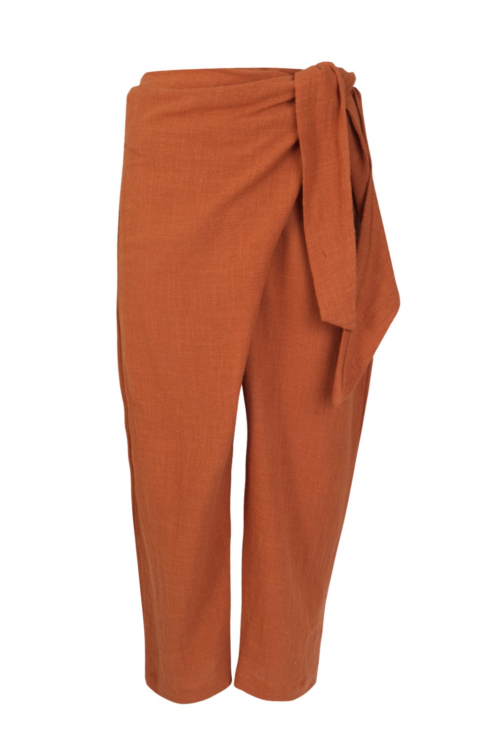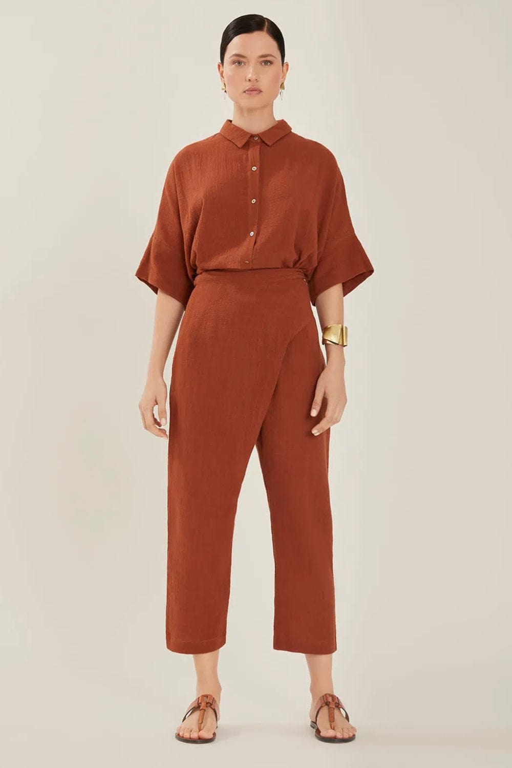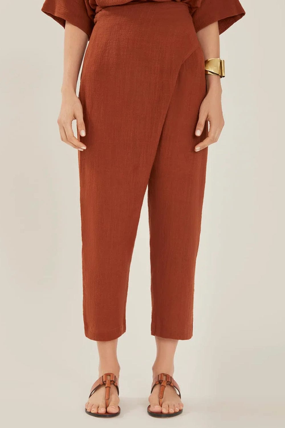 Calça lisa de algodão com modelagem transpassada e comprimento cropped.