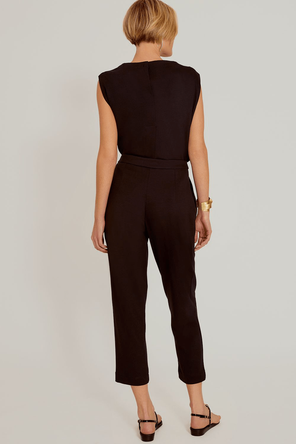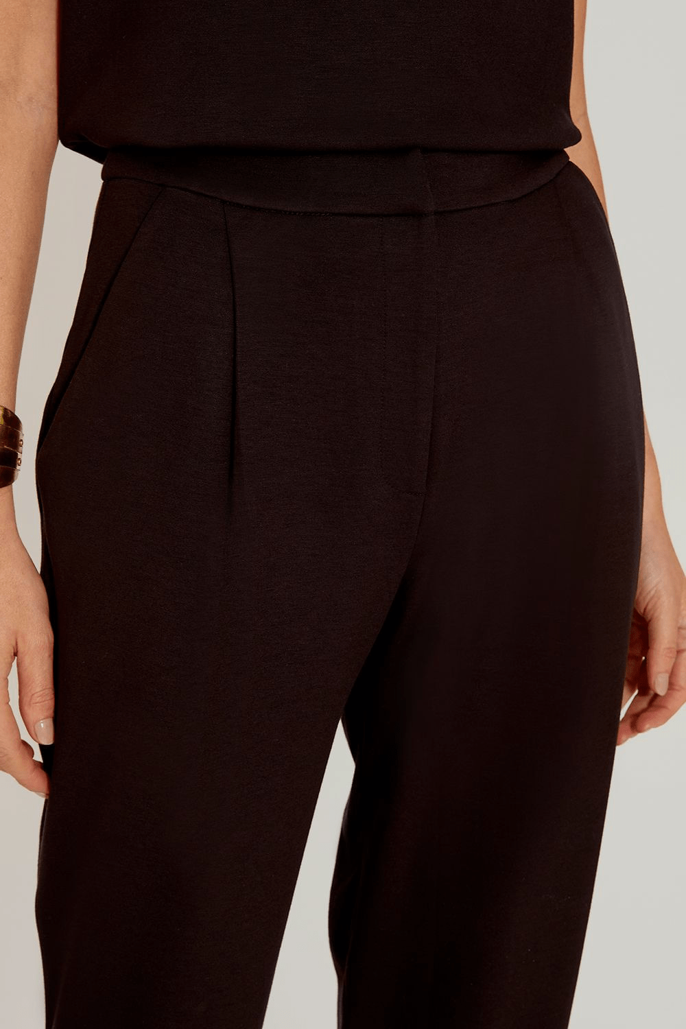 Calça em malha com modelagem de alfaiataria, bolso faca na frente e perna com leve afunilamento.