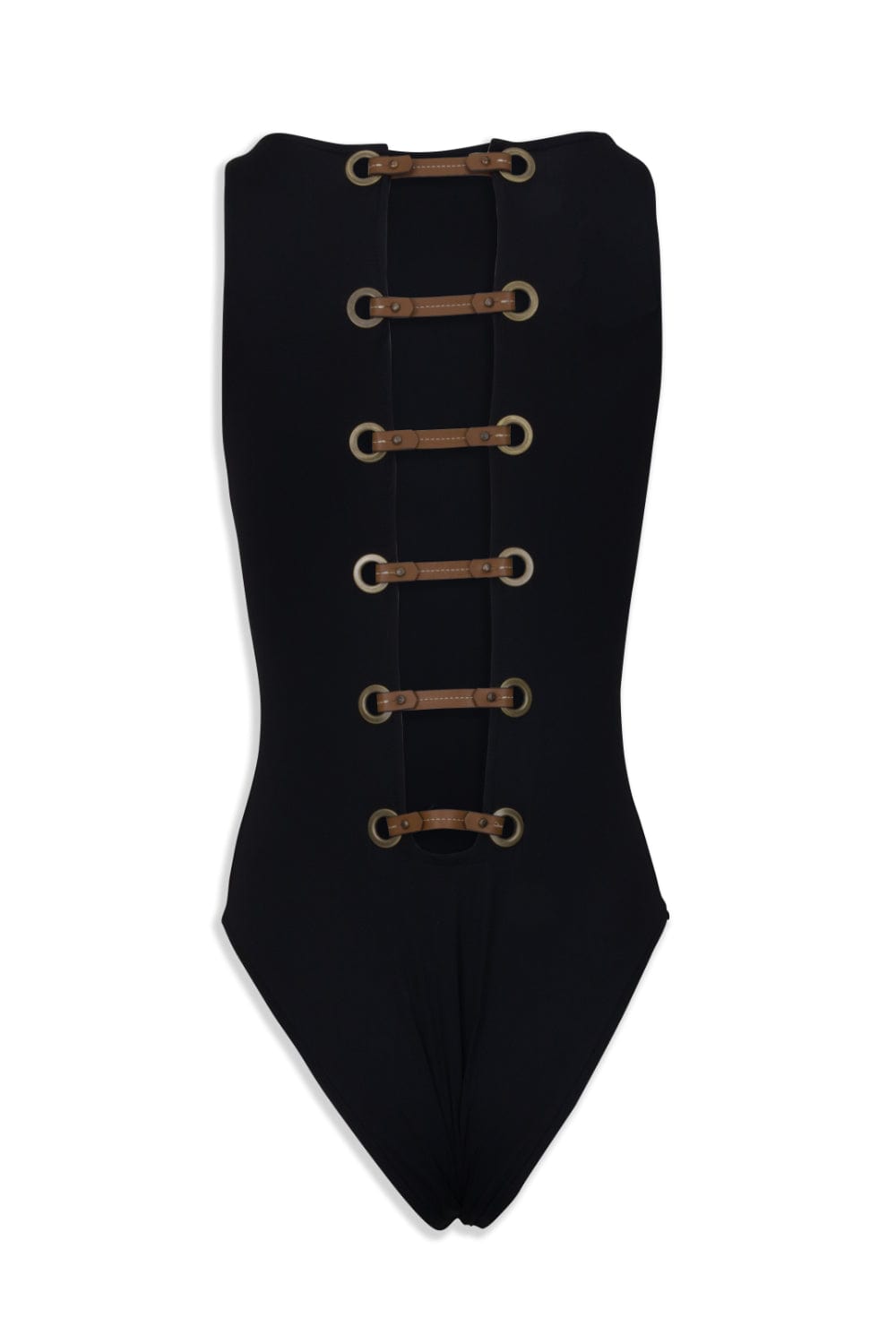 Maiô de decote alto com detalhe de ilhós e tiras em couro natural hidrofugado nas costas.