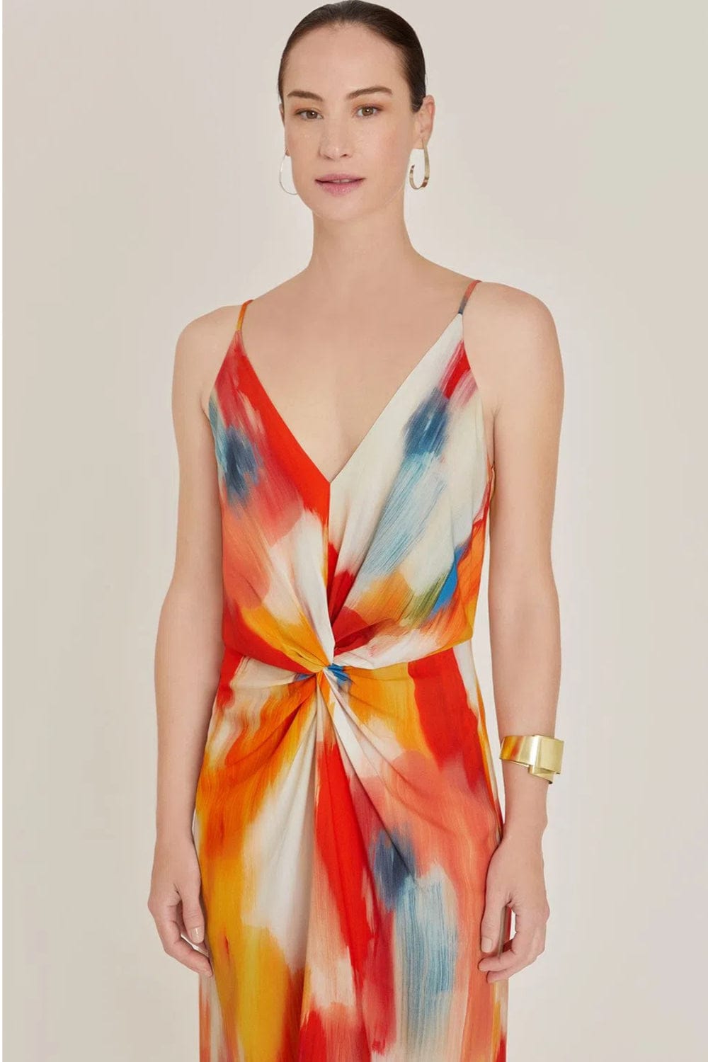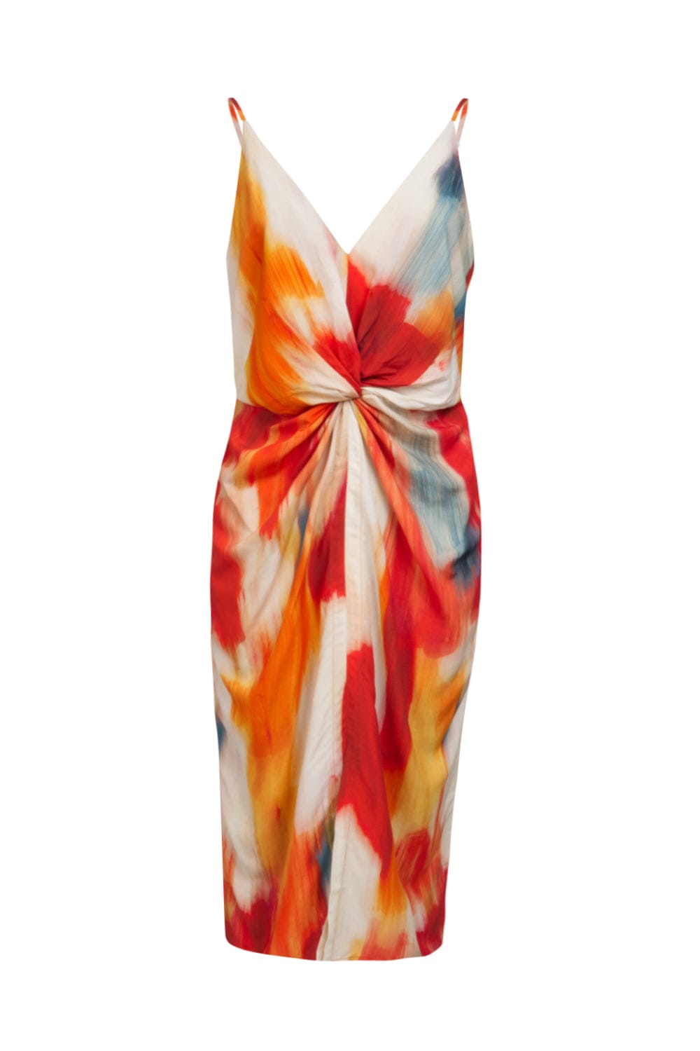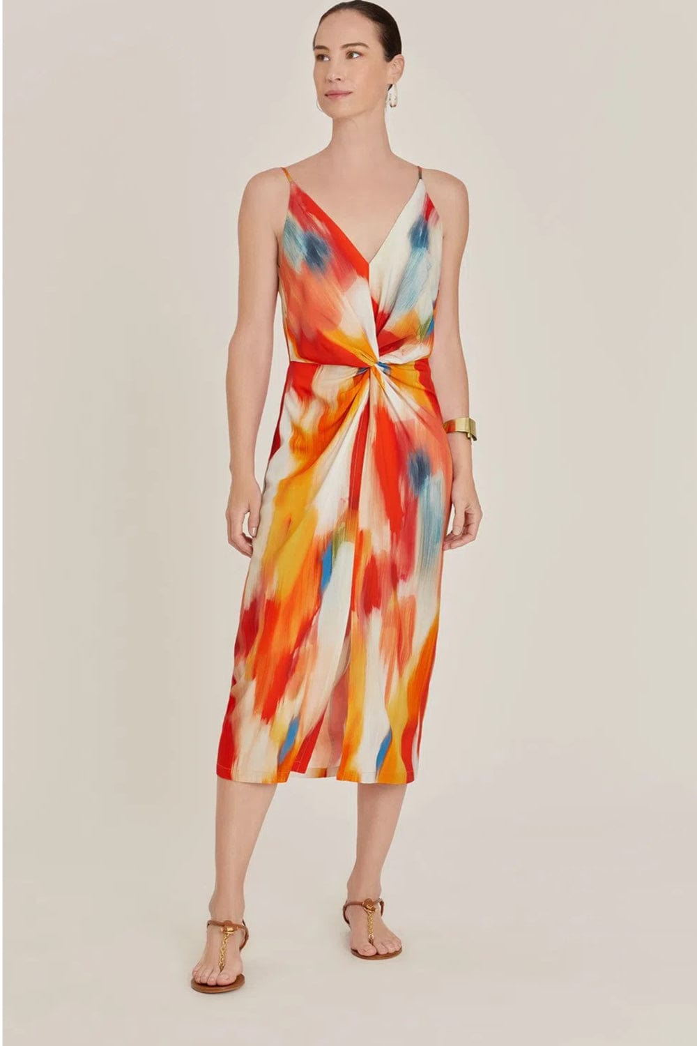 Possui torção na frente na altura da cintura e comprimento midi.