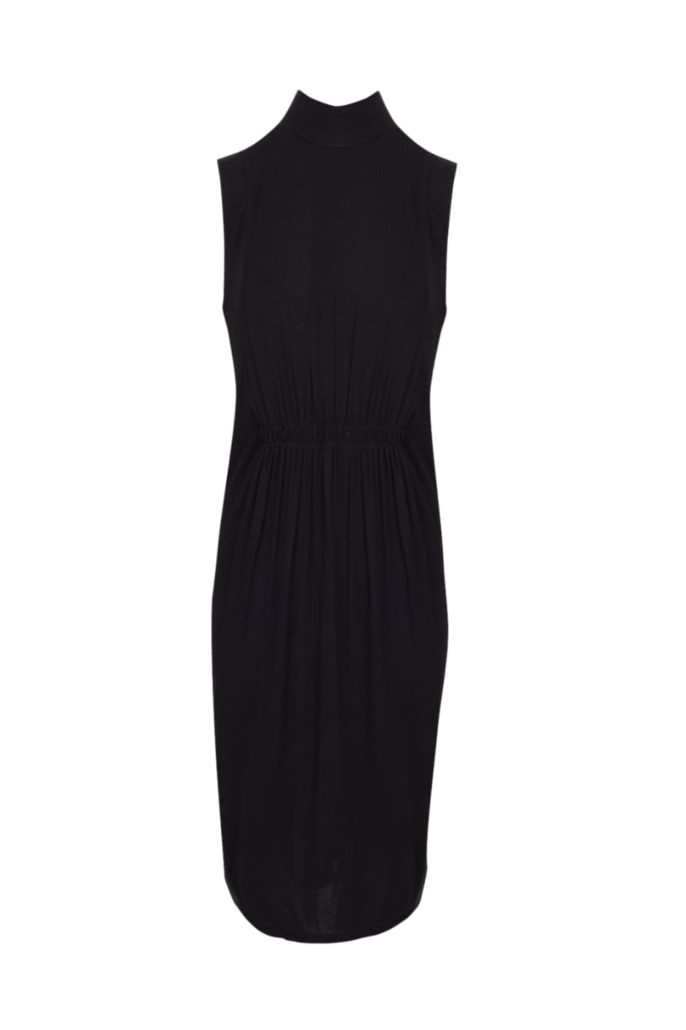 Vestido de malha tricot, gola alta, com modelagem reta, comprimento abaixo do joelho e elástico no centro frente.
