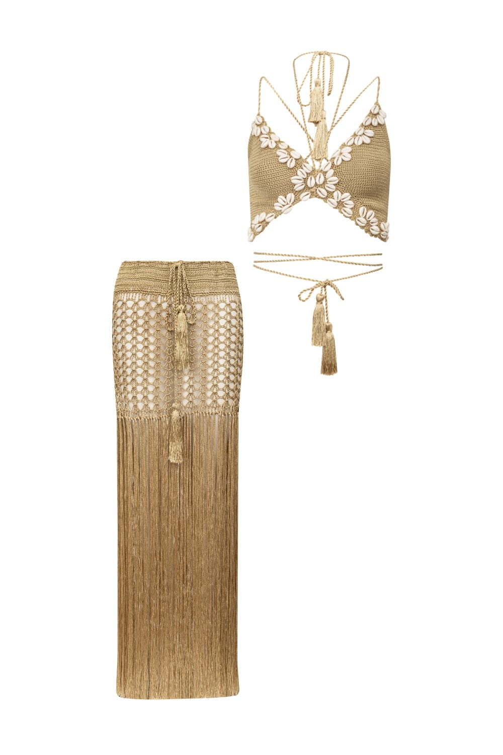 Club - Conjunto Saia e Cropped de Crochet com Búzios Dourado
