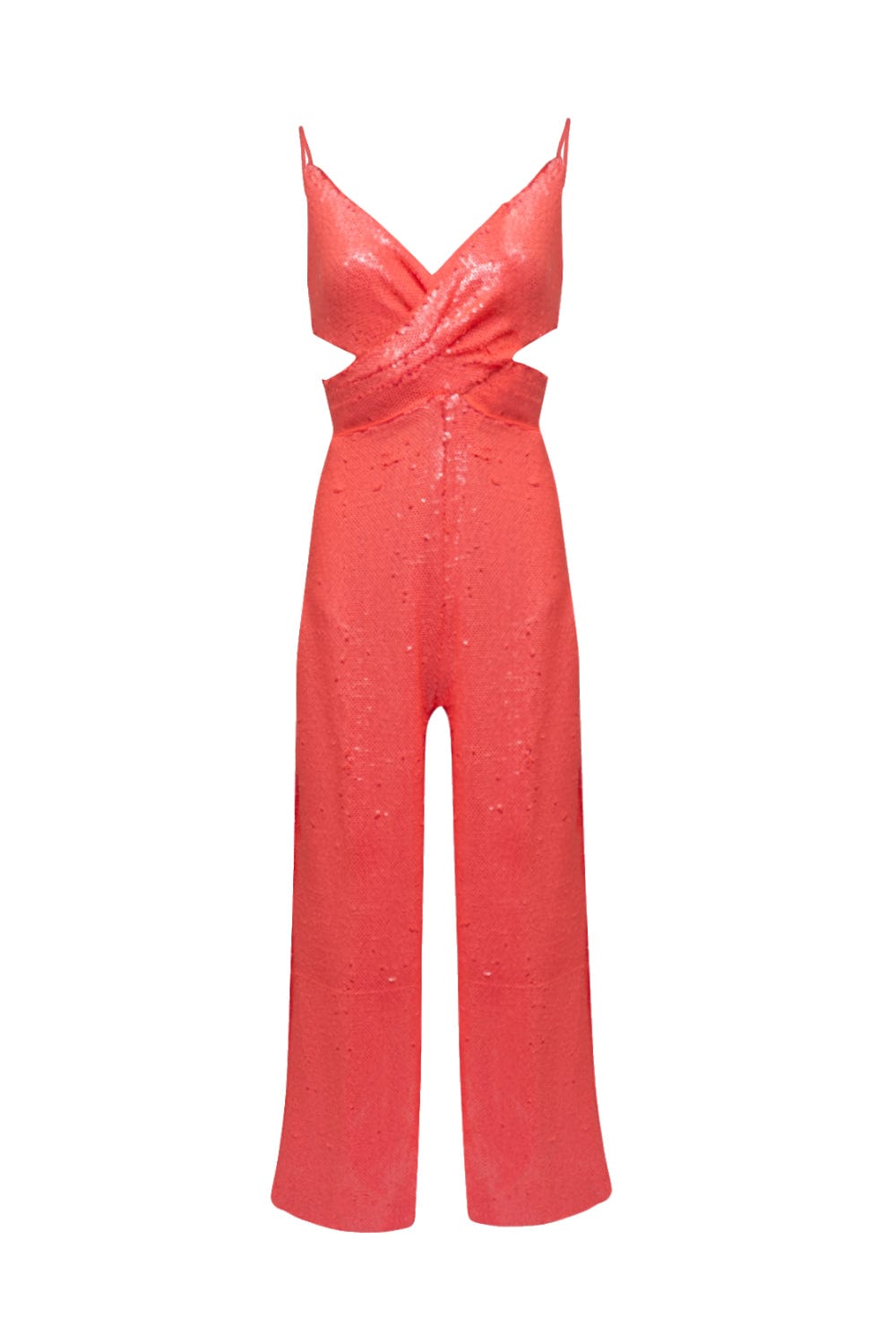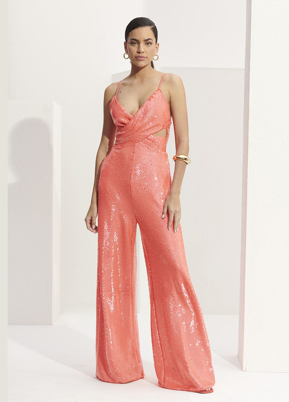 Peça em paetê possui decote V com detalhe transpassado na frontal, alças finas reguláveis, recortes vazados nas laterais, shape justo, modelagem pantalona, fecho posterior por botões e zíper.