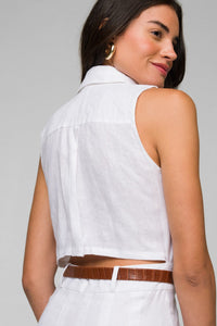 Ele é sem mangas e traz um detalhe único nas costas: um top solto que cria o efeito visual de blusa e saia, tornando-o ainda mais especial ao ser visto de costas, seu comprimento é longo e o forro curto na parte da saia garantem conforto e minimizam a transparência do linho, mantendo a leveza do tecido sem comprometer a elegância.