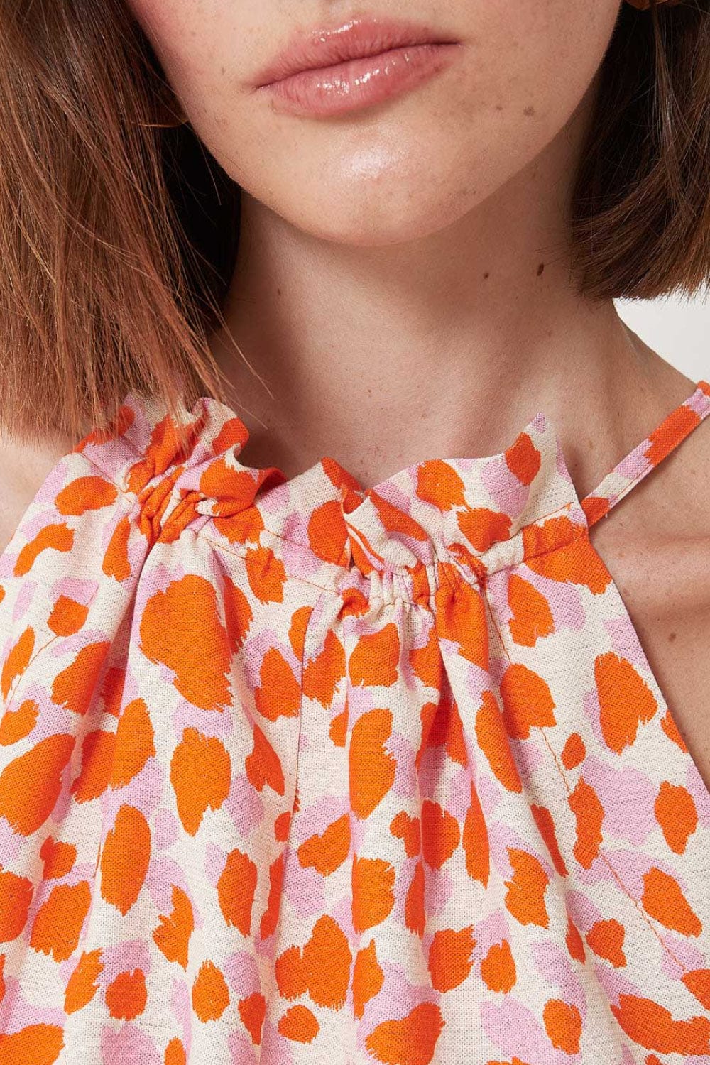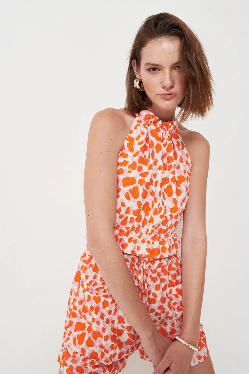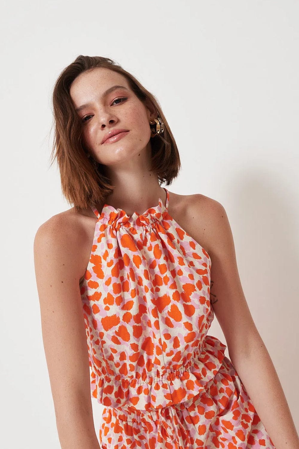 Regata cropped em tecido encorpado de algodão com viscose na estampa onça tropical, possui decote halter com gola alta franzida e ajuste traseiro.