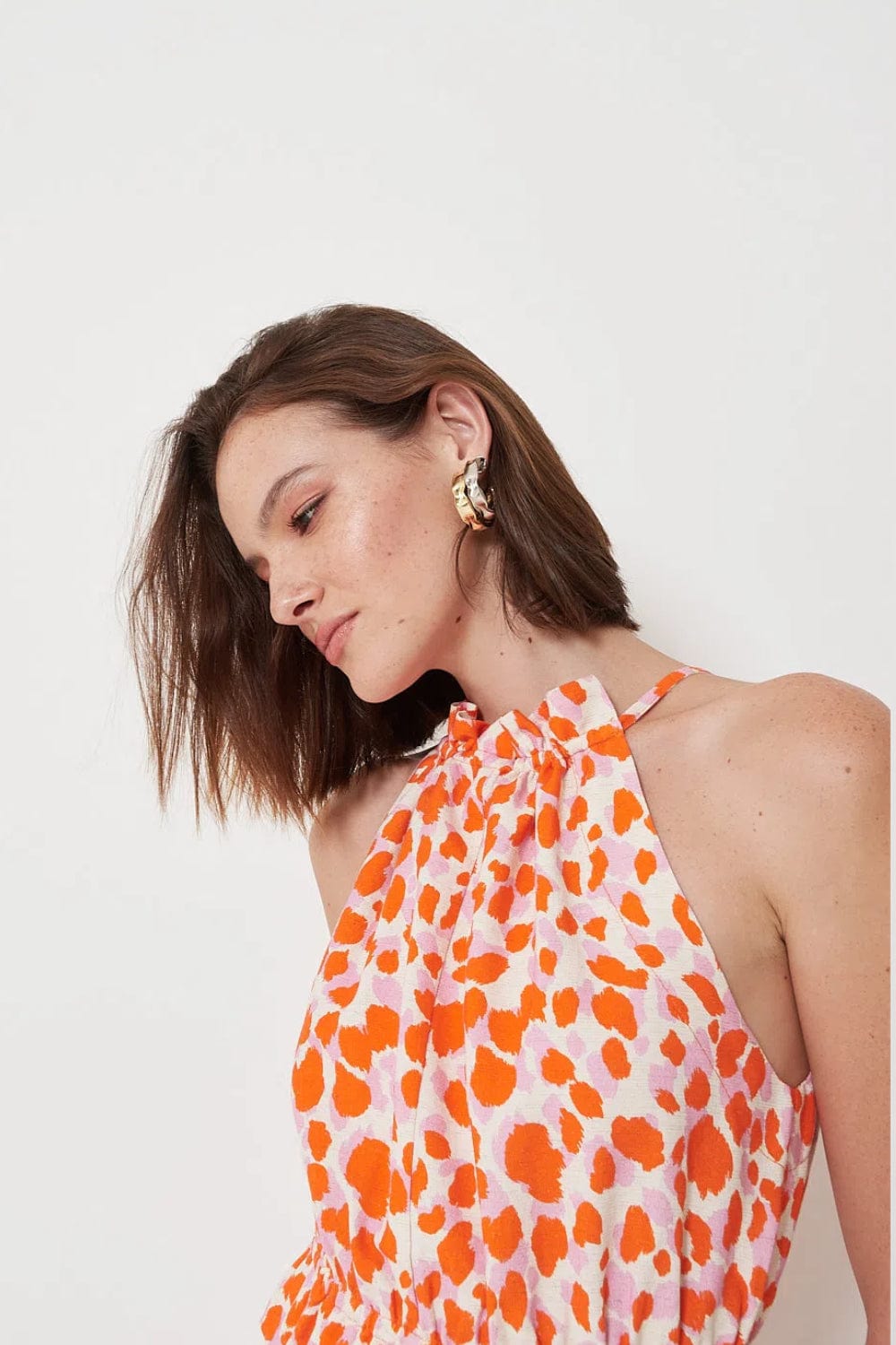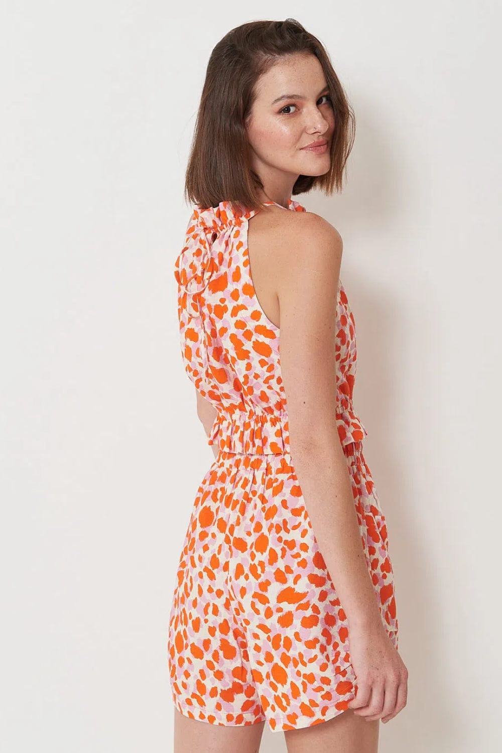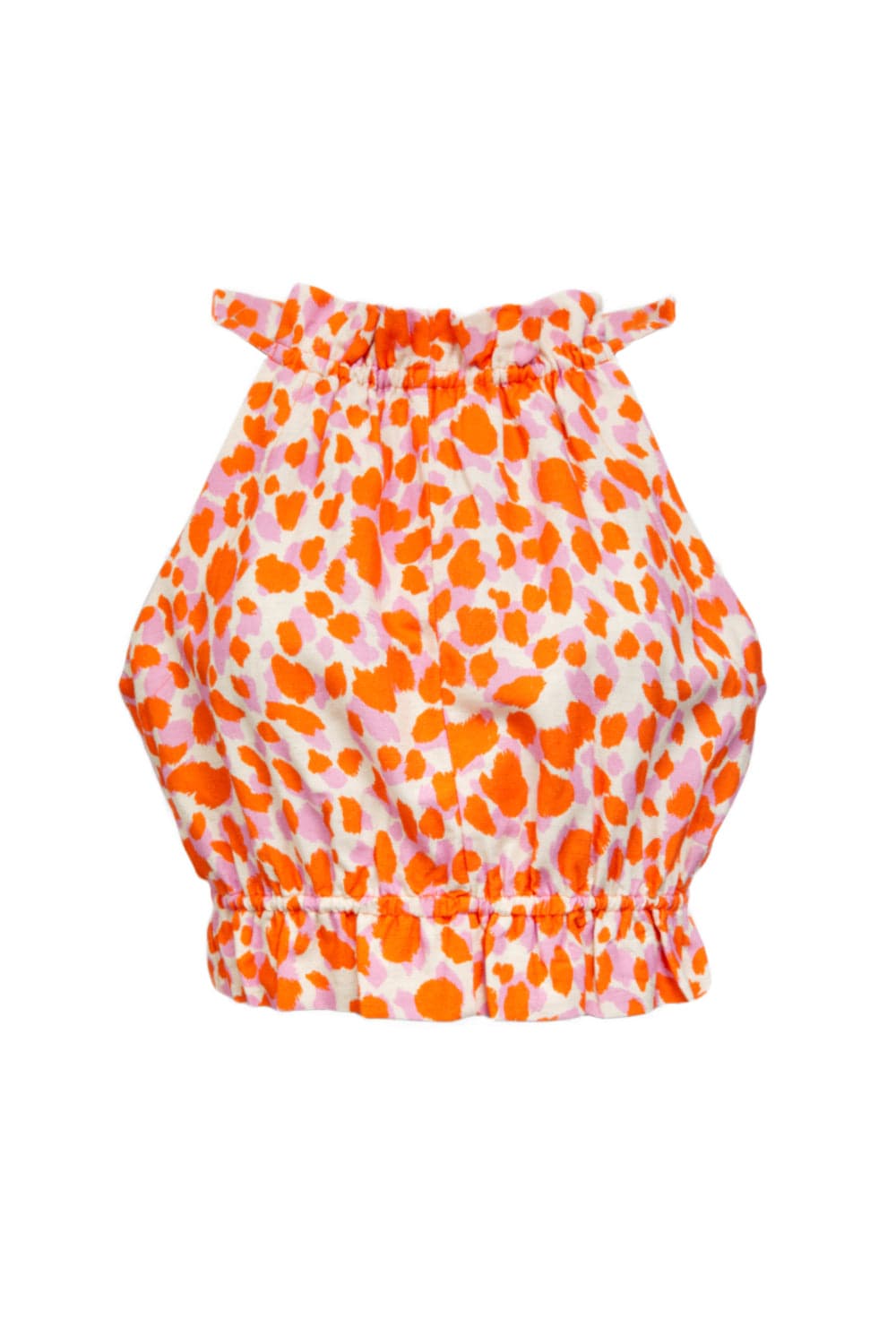 Regata cropped em tecido encorpado de algodão com viscose na estampa onça tropical, possui decote halter com gola alta franzida e ajuste traseiro.