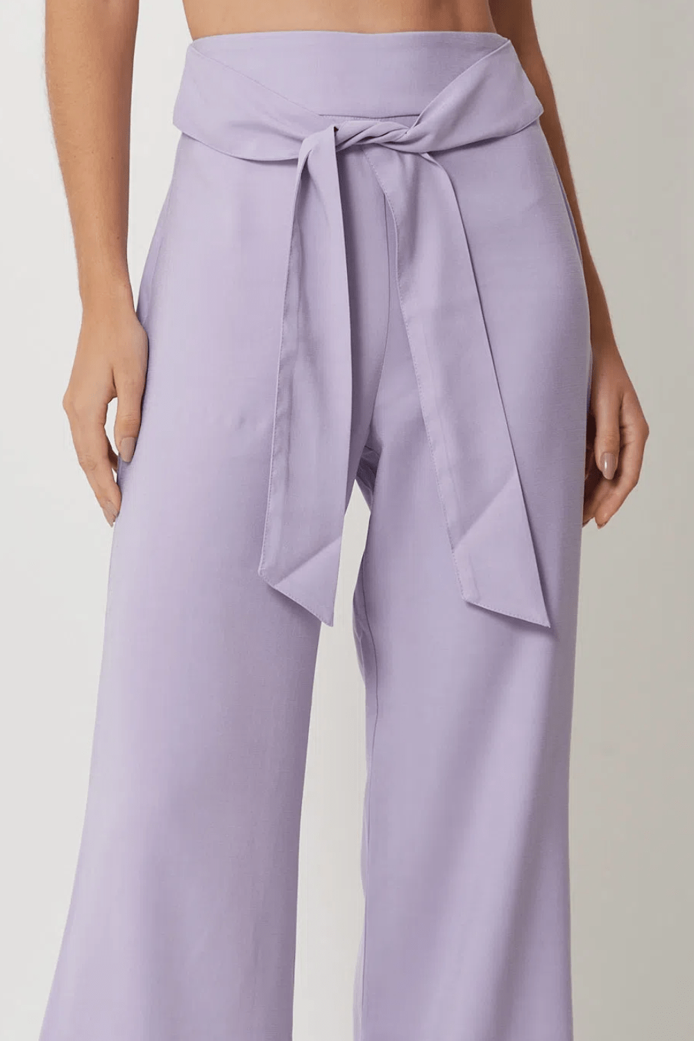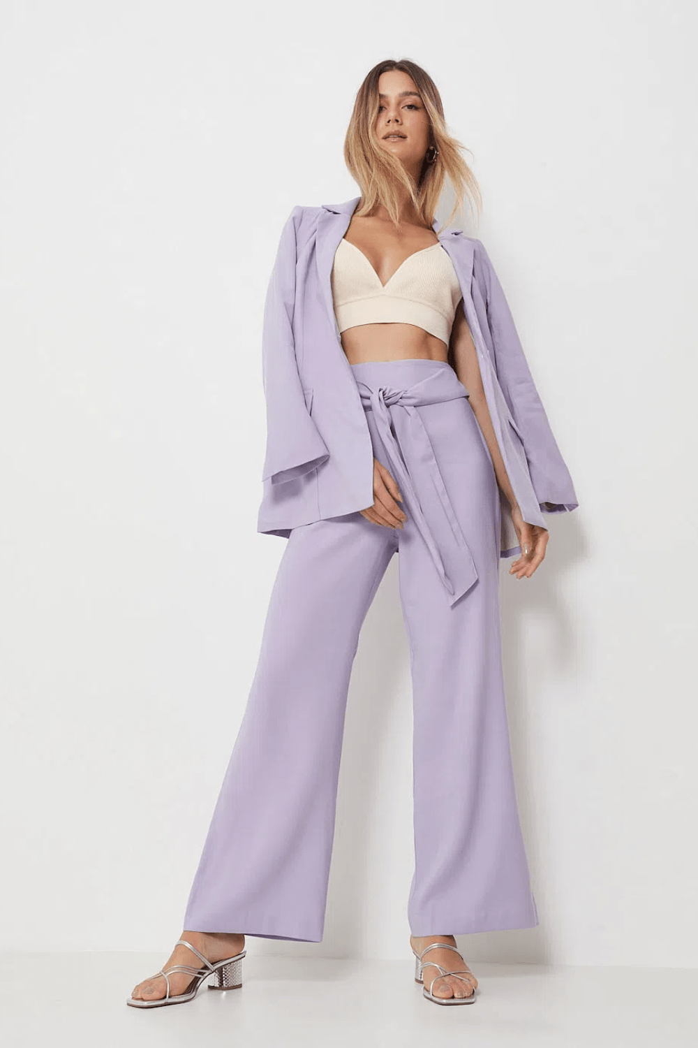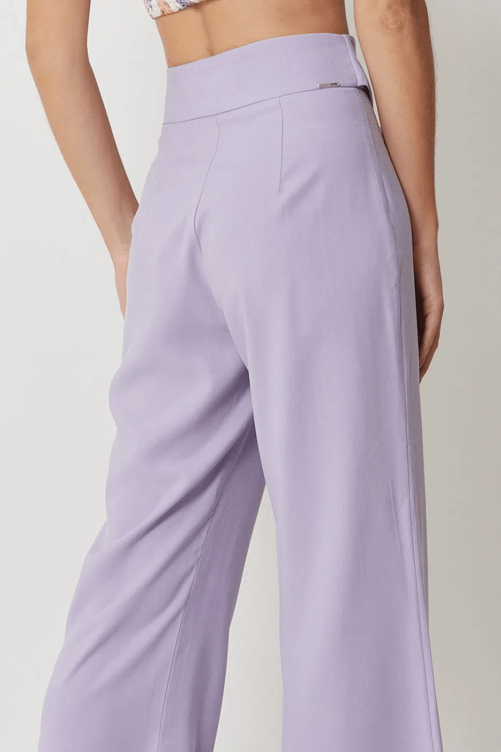 Calça reta em tecido plano de viscose com toque diferenciado, modelo com pala larga, faixa embutida para amarração e fechamento lateral em zíper aparente.