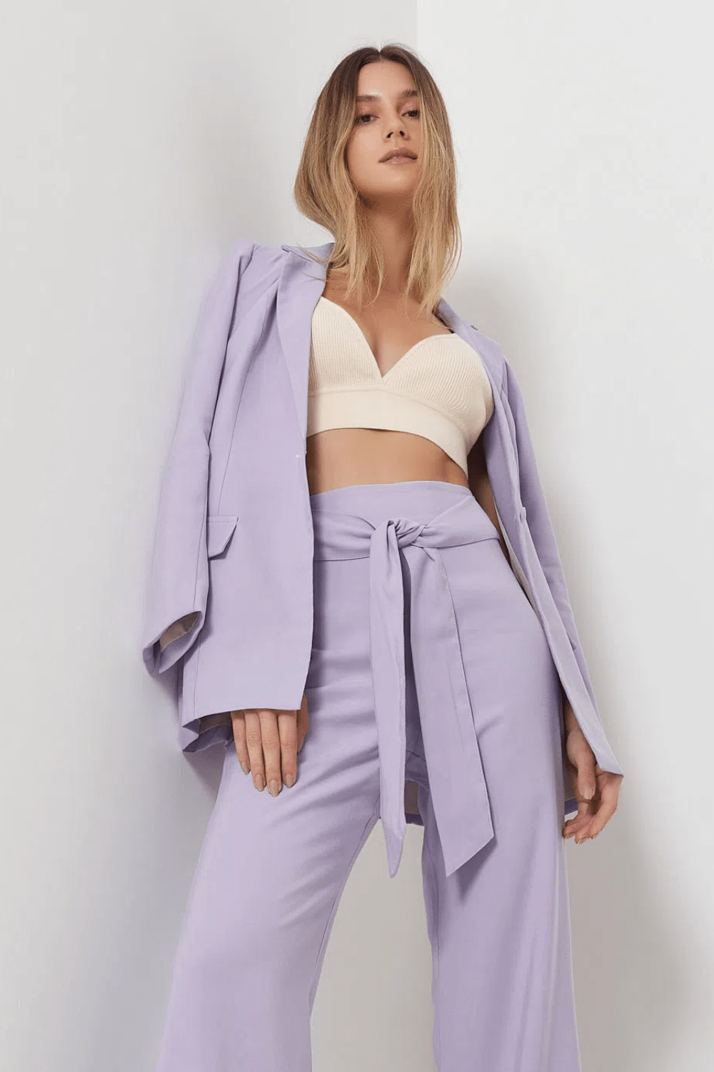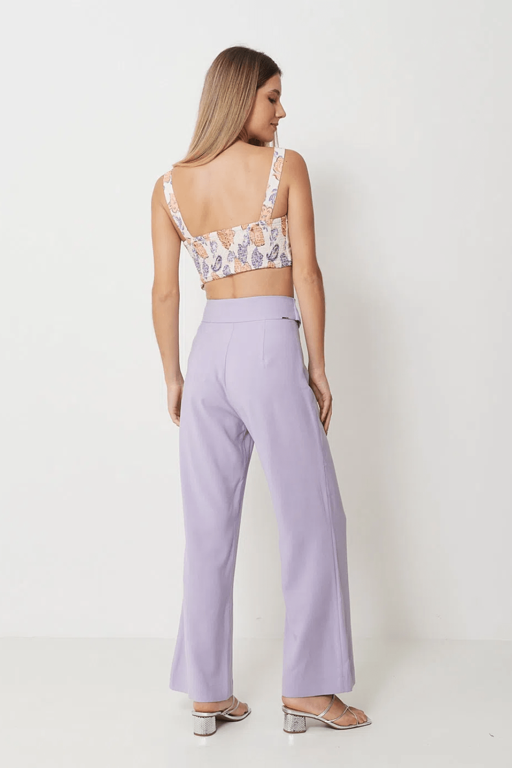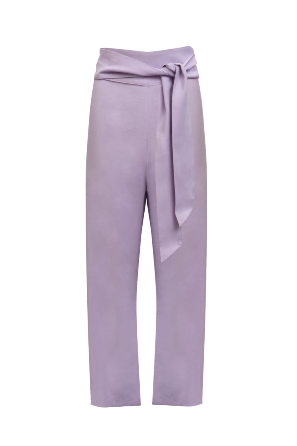 Calça reta em tecido plano de viscose com toque diferenciado, modelo com pala larga, faixa embutida para amarração e fechamento lateral em zíper aparente.