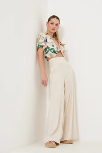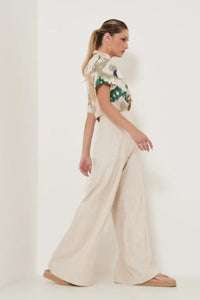 Calça pantalona em tecido plano com linho, possui pala larga, bolso faca lateral, fechamento com zíper e recorte no centro da perna.