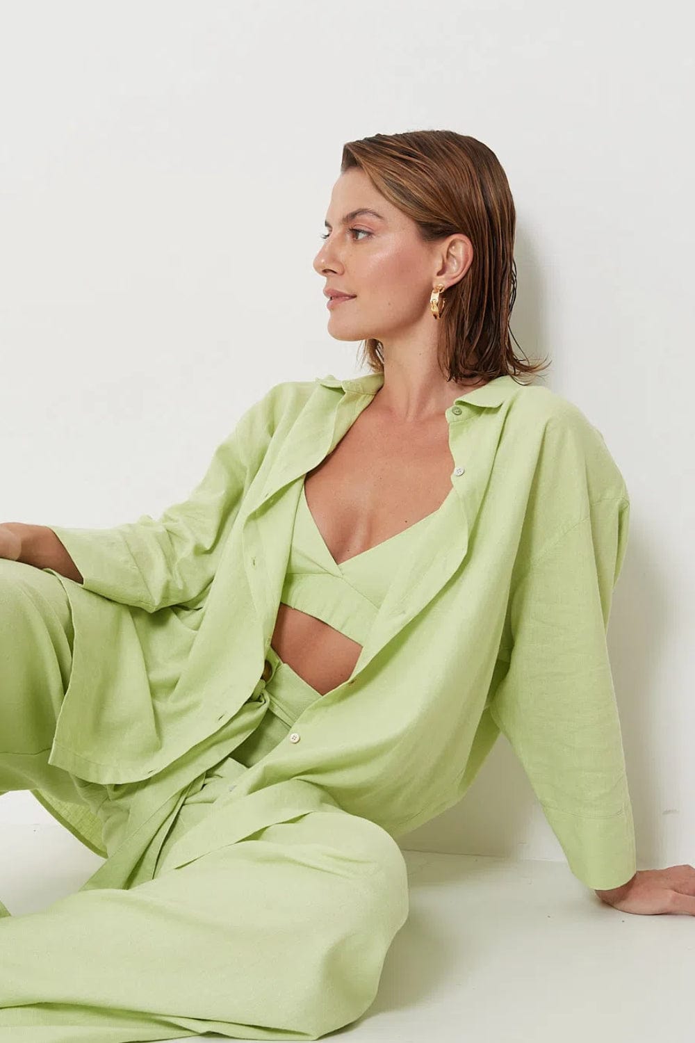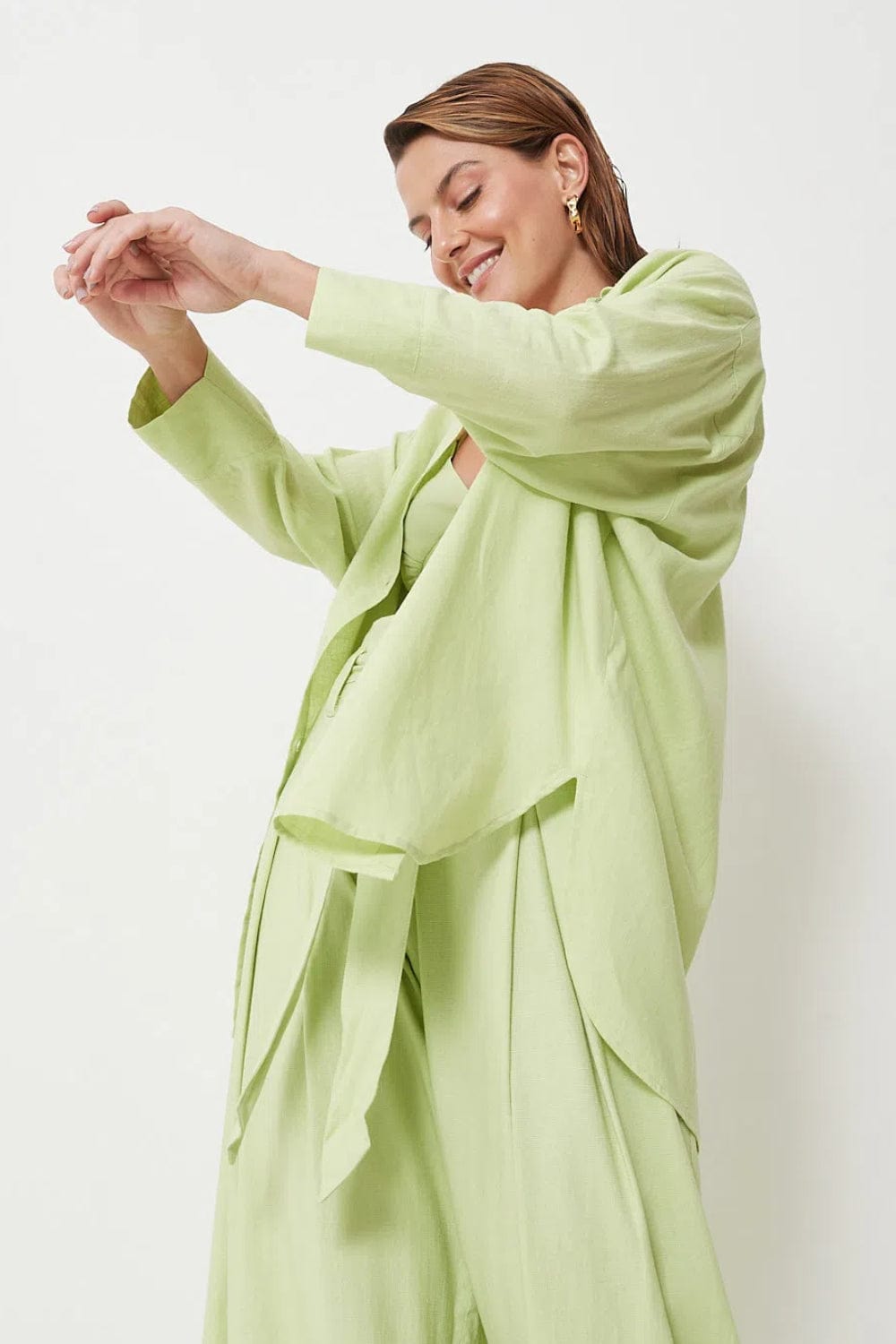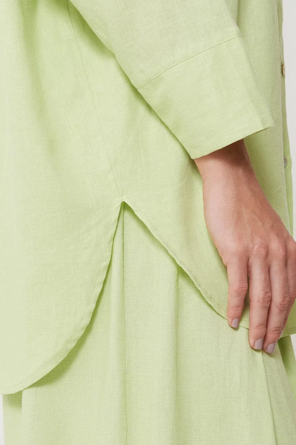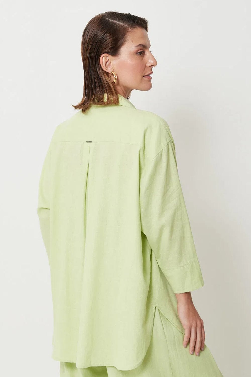 Camisa ampla em tecido plano de linho com viscose, possui mangas 3/4 com maxi punho, abotoamento frontal com gola clássica e fenda nas laterais.