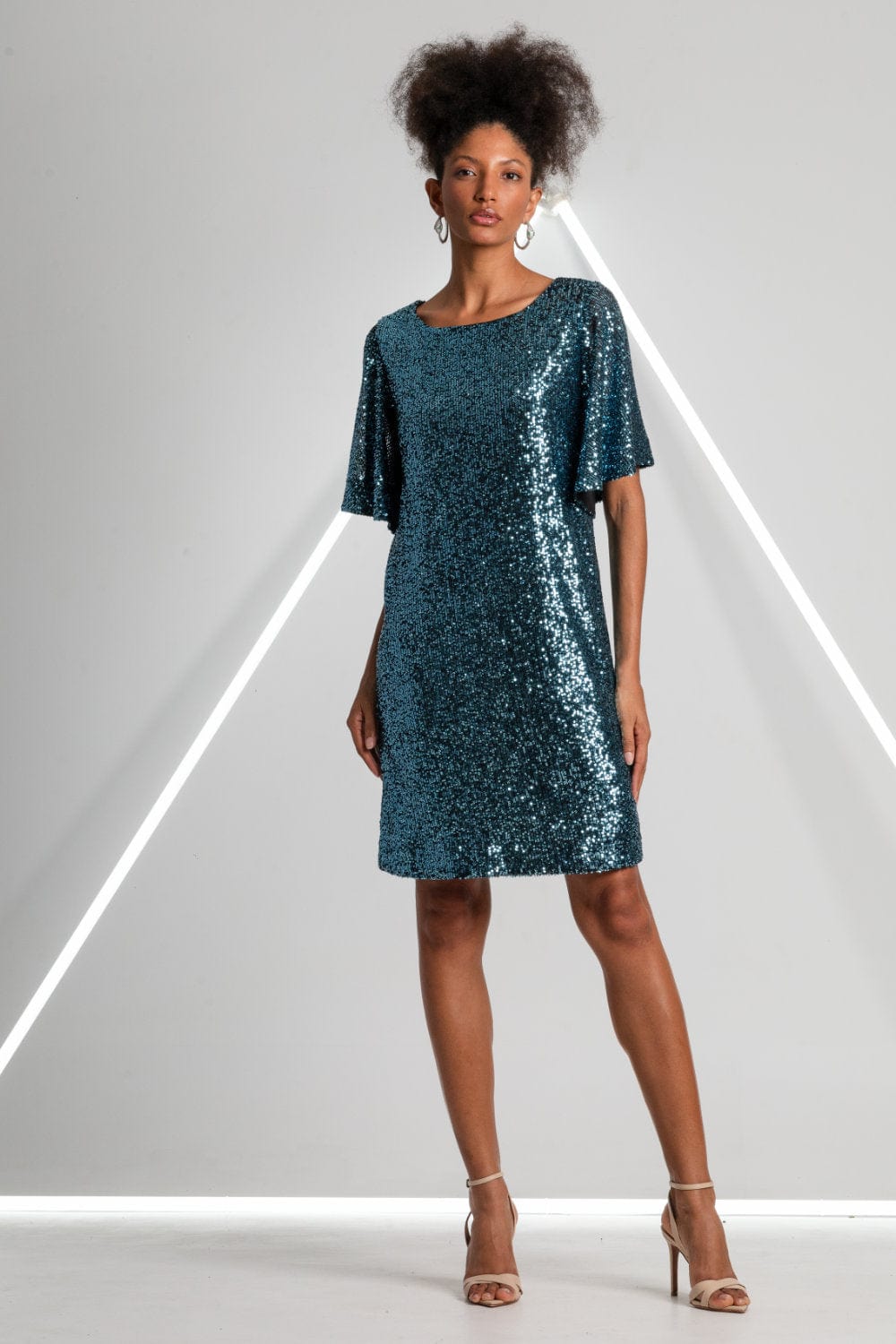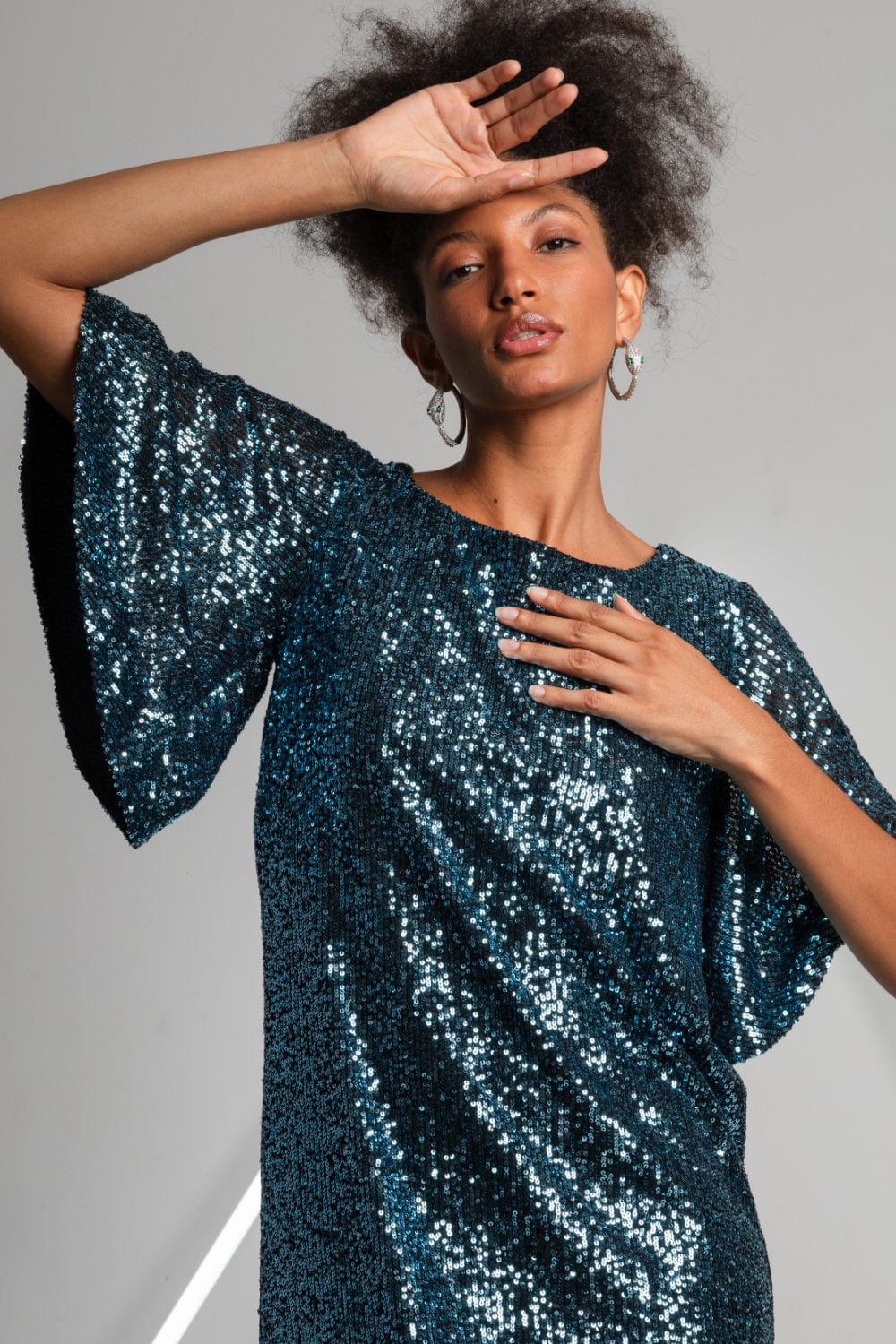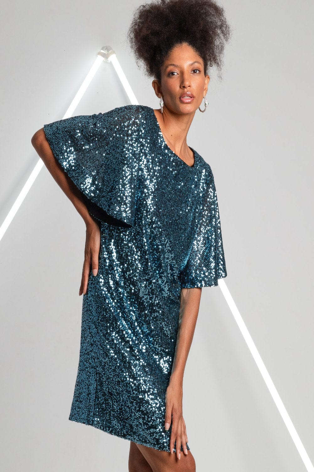 MOB - Vestido Curto Manga Curta Paetês Azul Petróleo