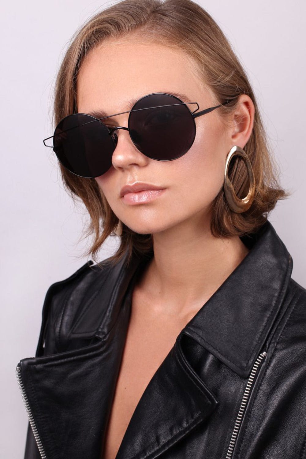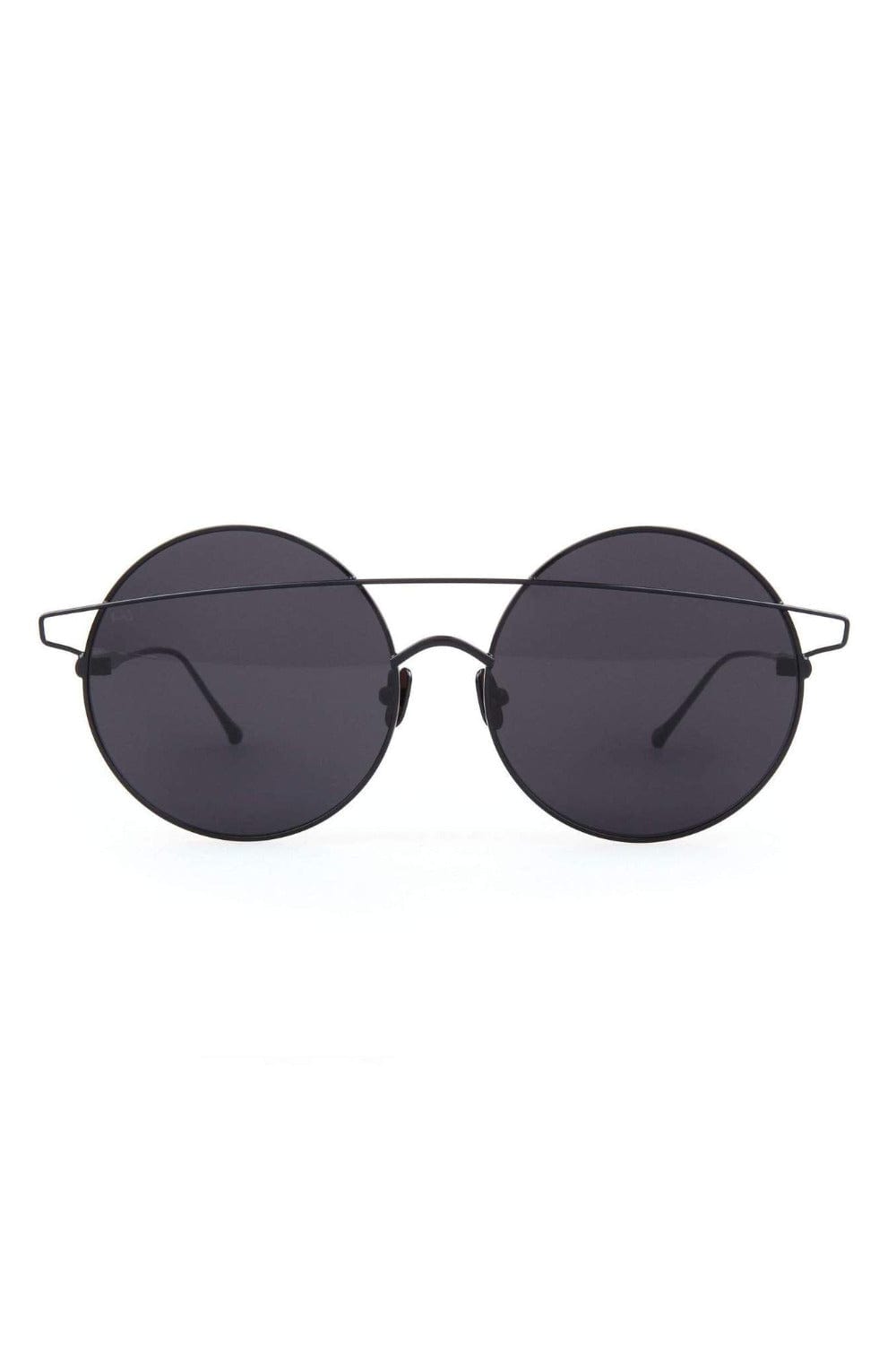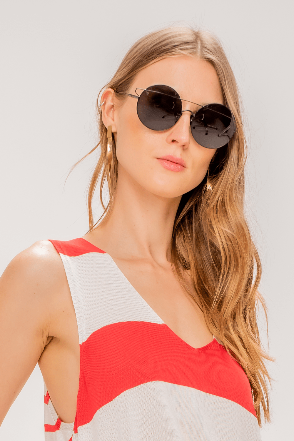 Os óculos de sol MYKONOS têm lentes de náilon espelhado cinza escuro, planas e redondas que são universalmente atraentes e atemporais. As armações de metal em tom preto têm uma barra de sobrancelha geométrica sobreposta que cria uma aparência distinta e moderna. 100% de proteção UV. Protetores de nariz ajustáveis, testadas contra alergia para o máximo conforto.