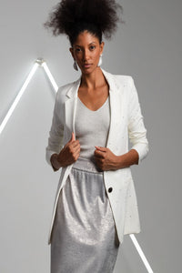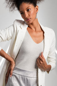 Esta blusa em tricot canelado possui um leve brilho que adiciona um toque elegante ao seu look.