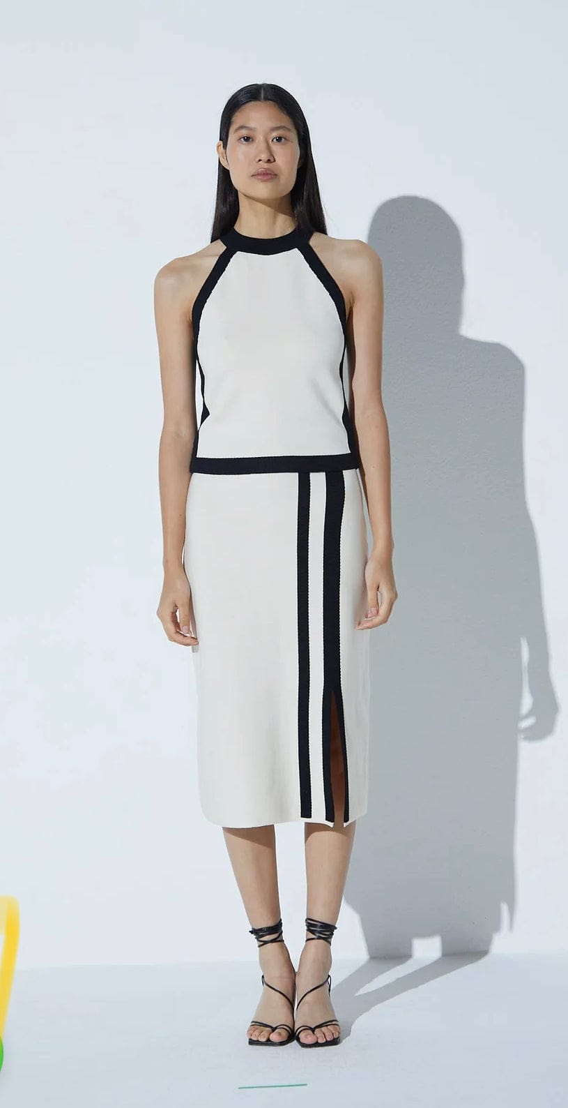 A Blusa Em Tricot Decote Nadador Ninive é confeccionada em tricot, possui decote nadador é elegante e a suas listras na cor preta são destaque, conferindo um toque minimalista ao visual.