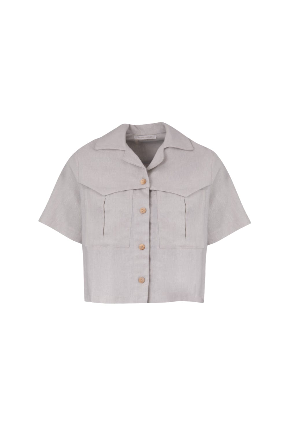 Viviane Furrier - Camisa Manga Curta Viscolinho com Bolsos em Tecido Areia