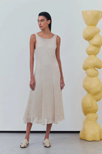 O Vestido Maxi Sem Mangas apresenta um belíssimo ponto telado de aspecto rústico e comprimento midi, perfeito para quem busca conforto e sofisticação.