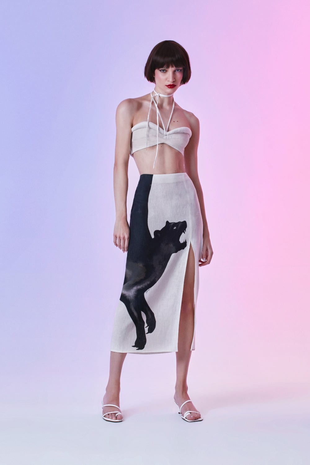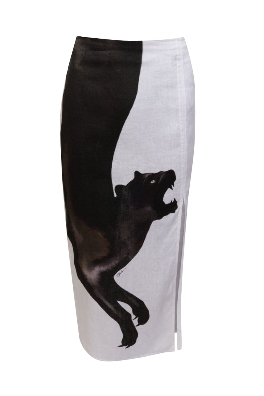 Yukio - Saia Midi Linho Pantera Clássica Off White
